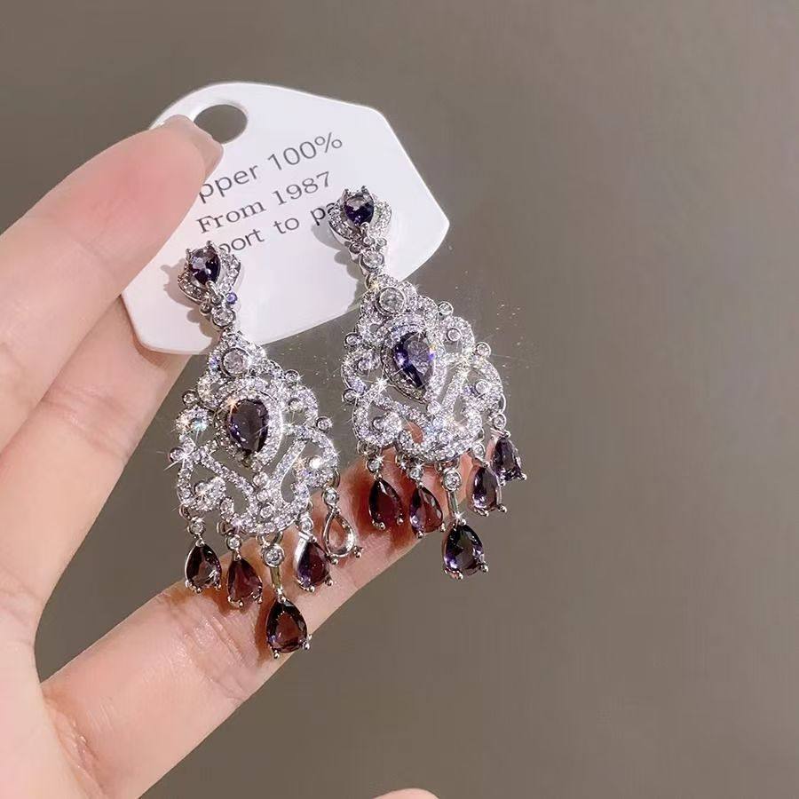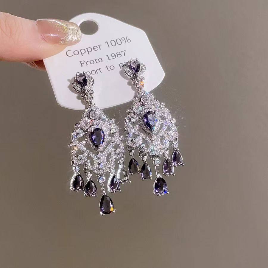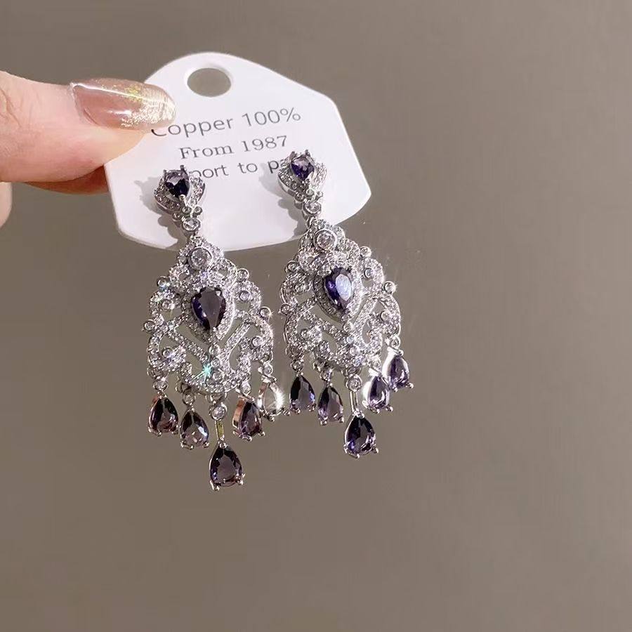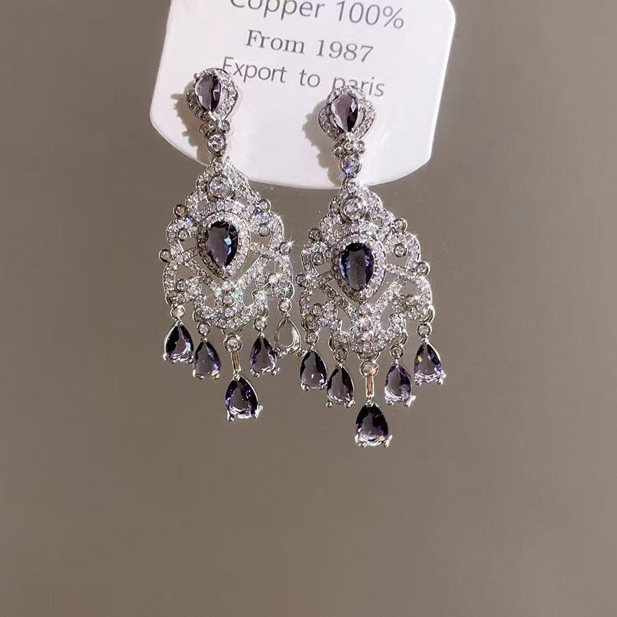 「千钻」重工暗紫色锆石耳环夸张大气奢华宫廷流苏耳坠耳饰女