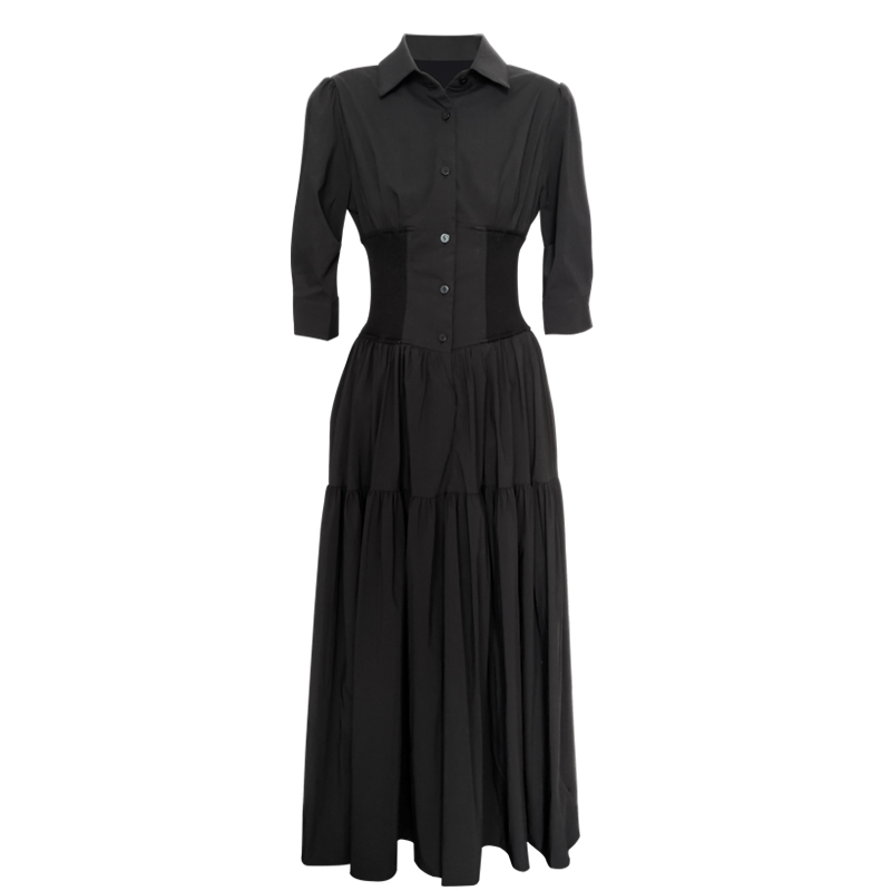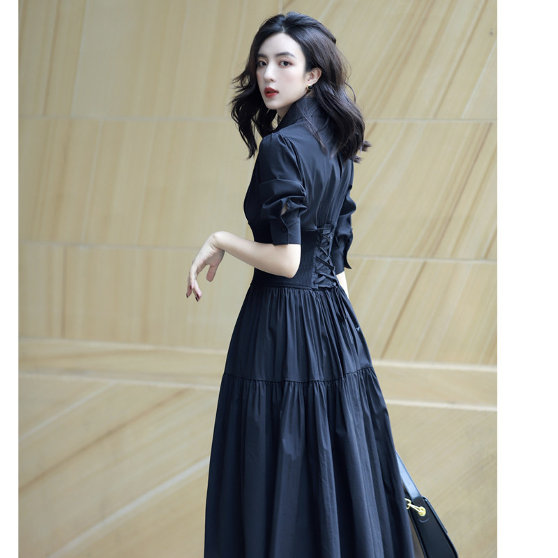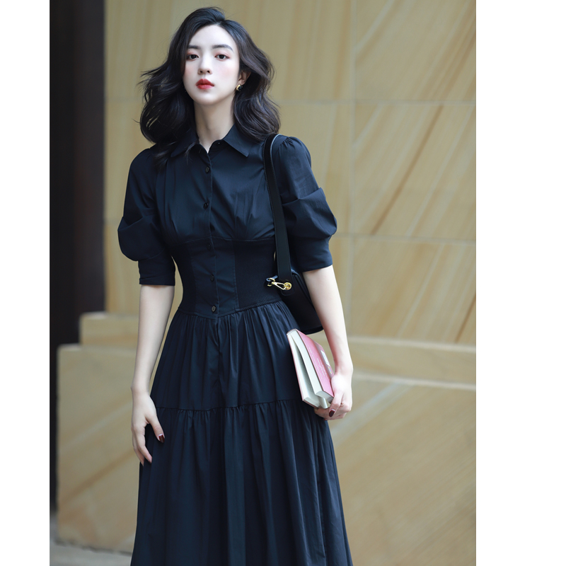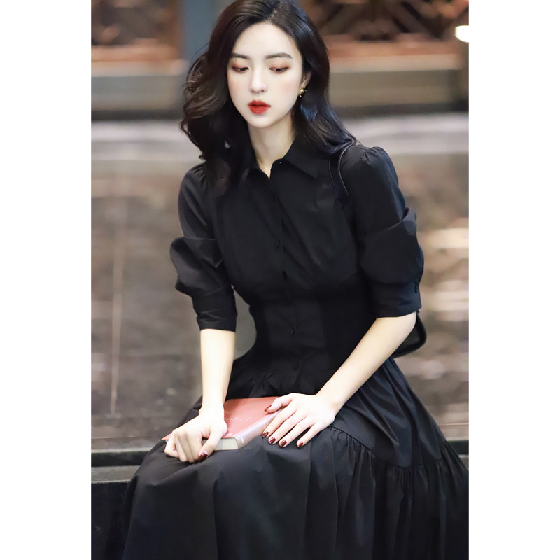JUJU赫本小黑裙法式复古衬衫裙收腰显瘦翻领高级感黑色连衣裙女夏