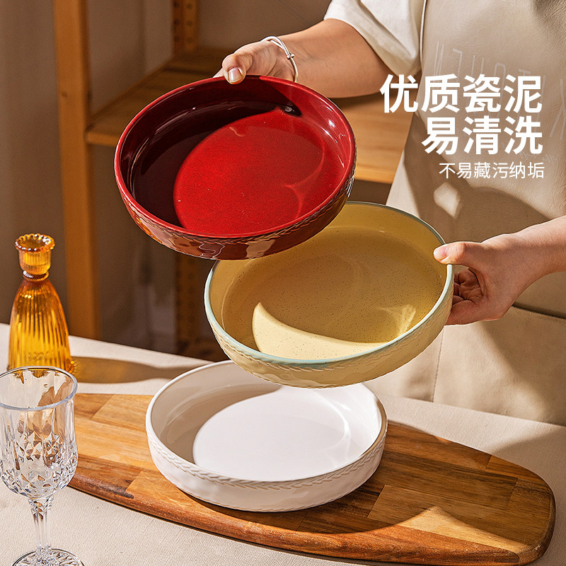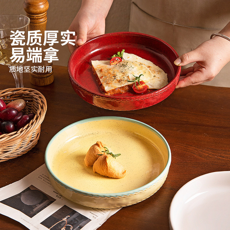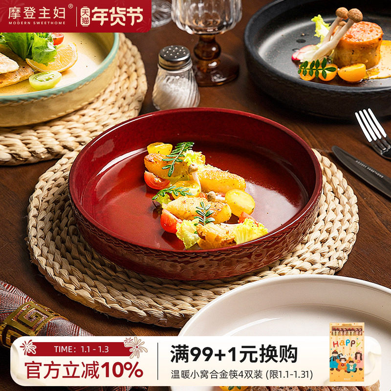 摩登主妇窑变红色盘子菜盘家用新年餐具高级深盘水果盘牛排西餐盘