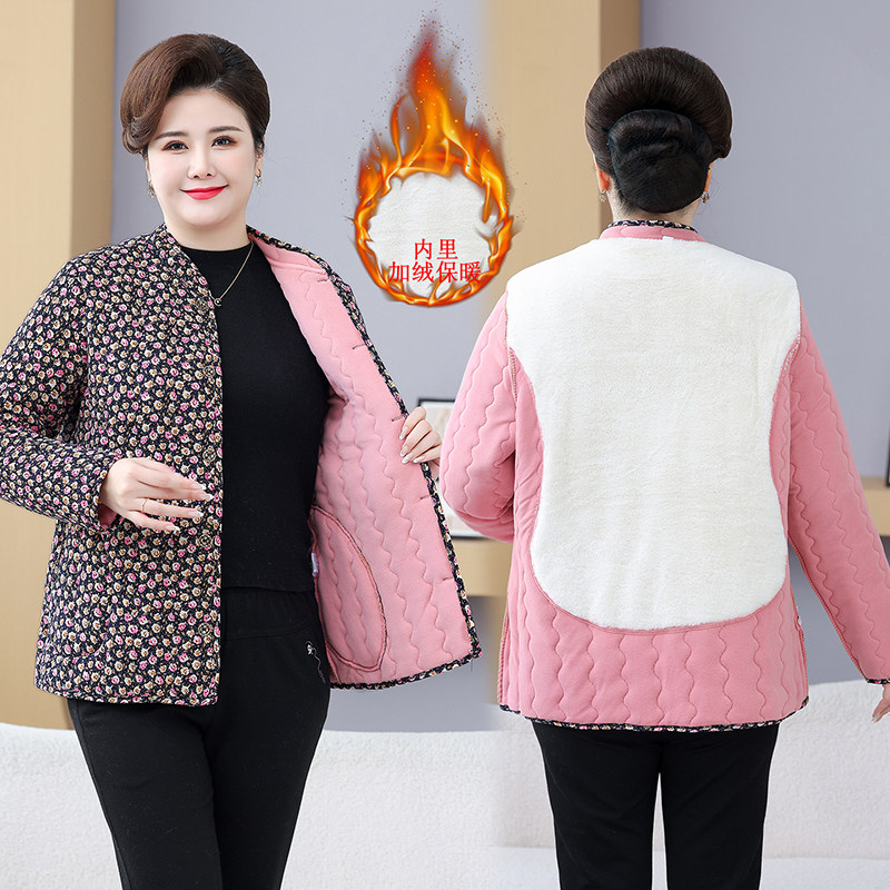 妈妈秋冬季加绒外套女中老年人大码宽松翻领棉衣三层加厚棉服上衣