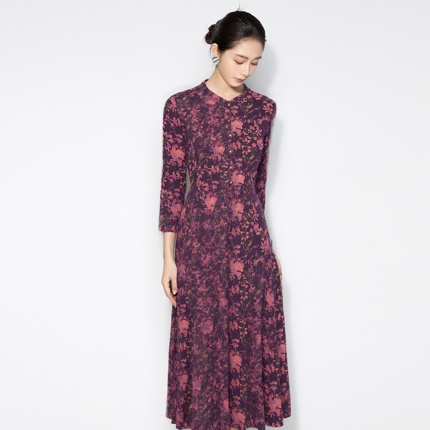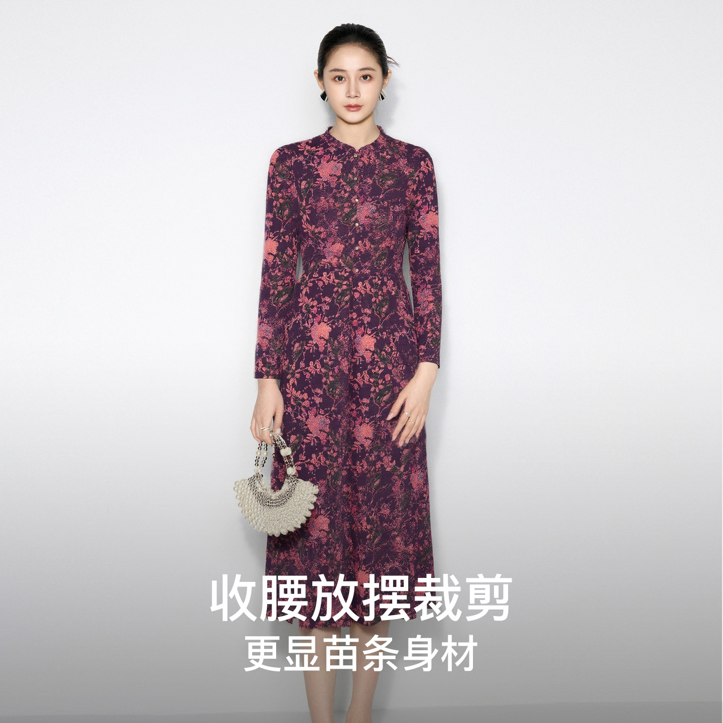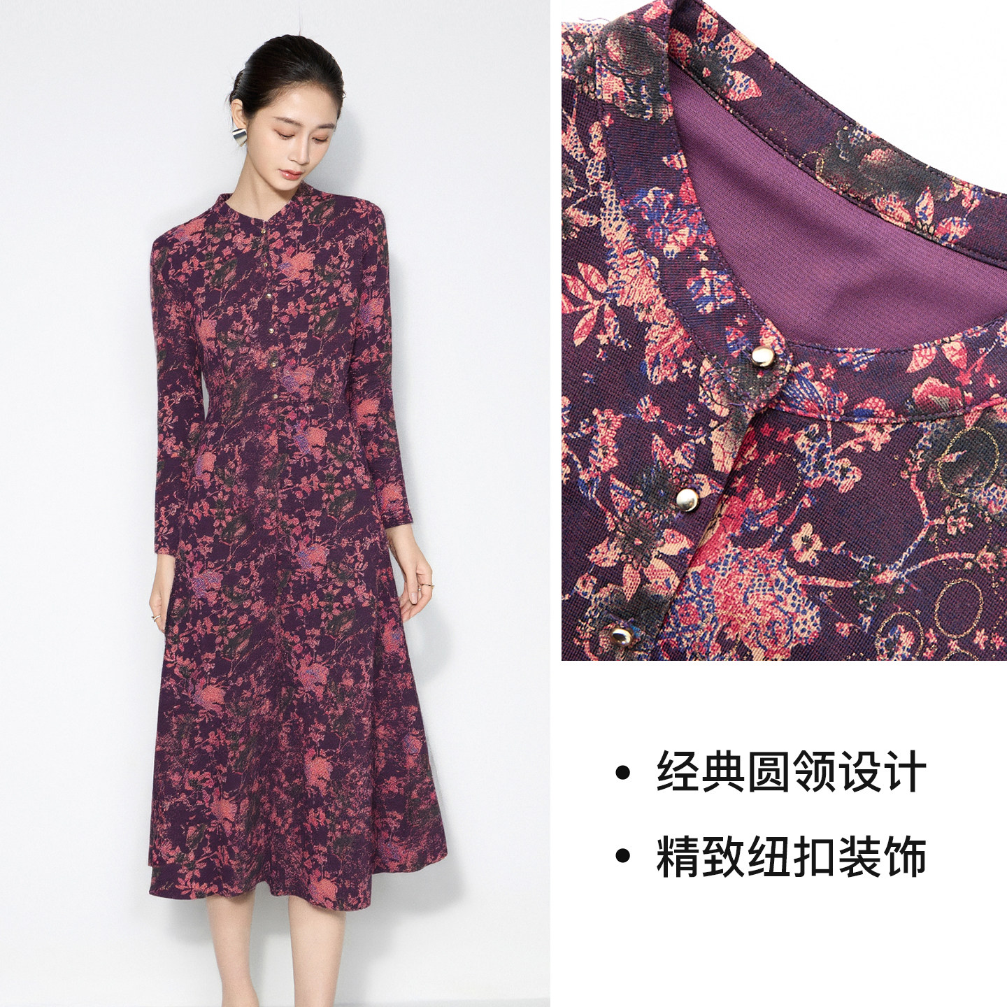 马天奴2025秋冬新款紫色印花圆领长袖收腰连衣裙子长裙法式气质女