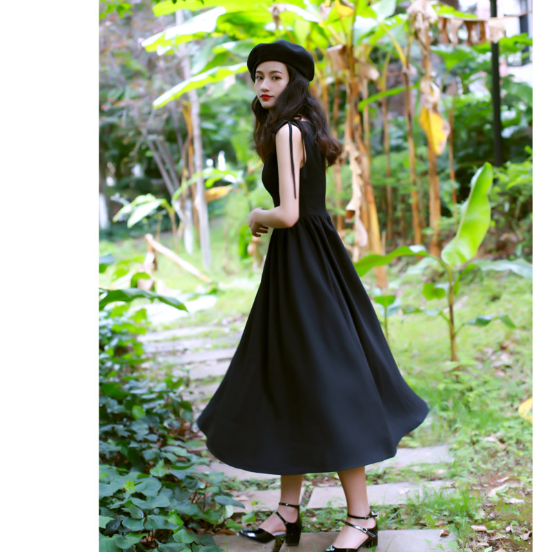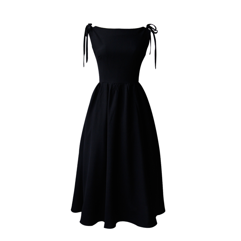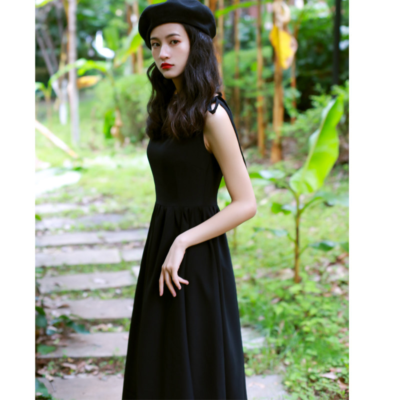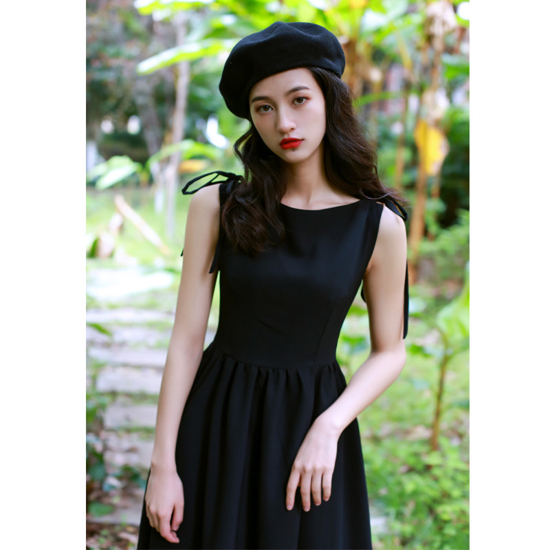 复古赫本风小黑裙绑带一字领收腰连衣裙显瘦女派对小礼裙长裙春夏