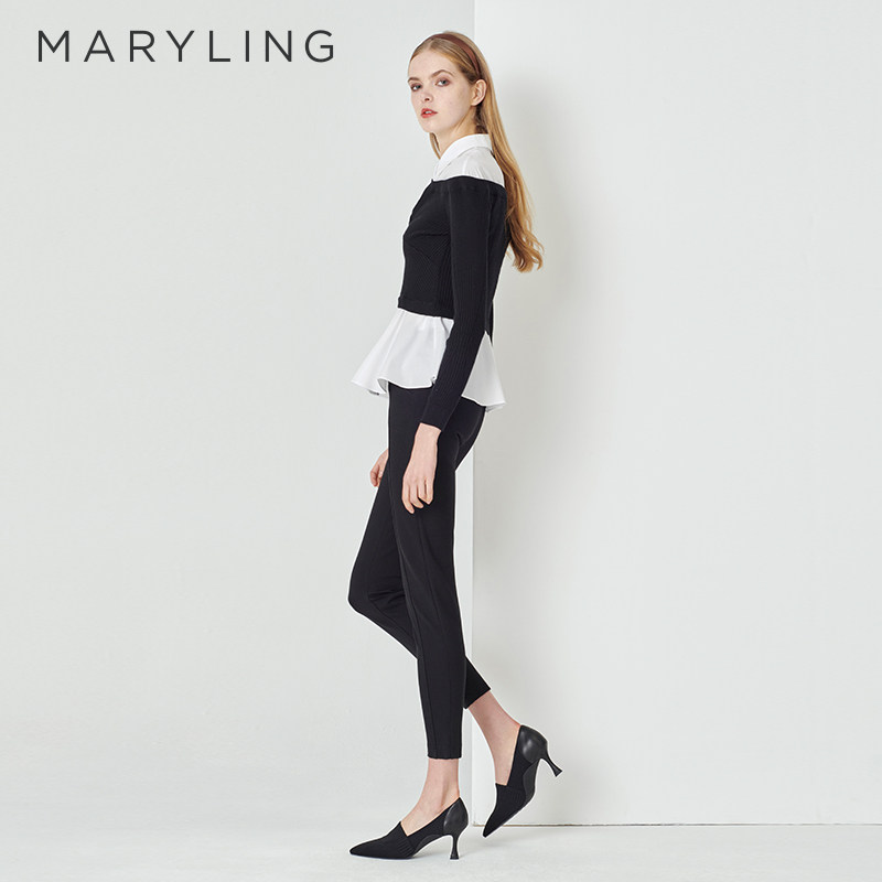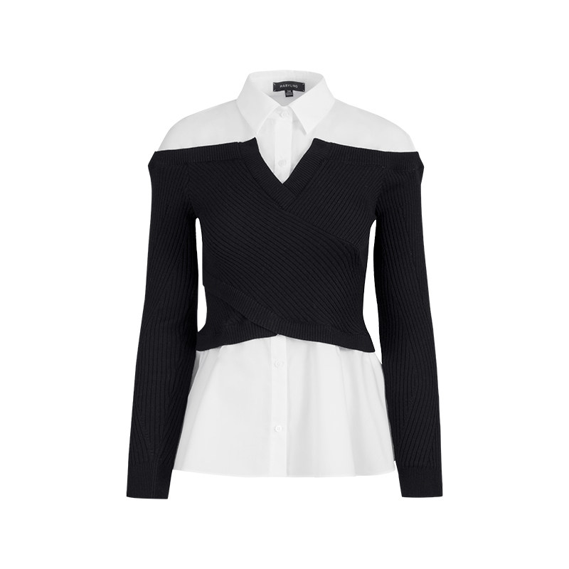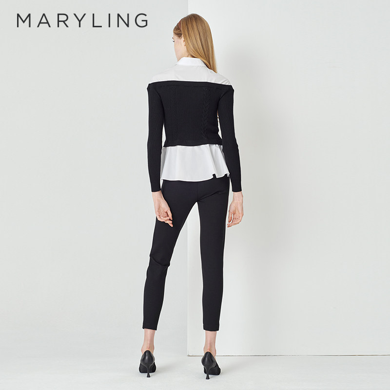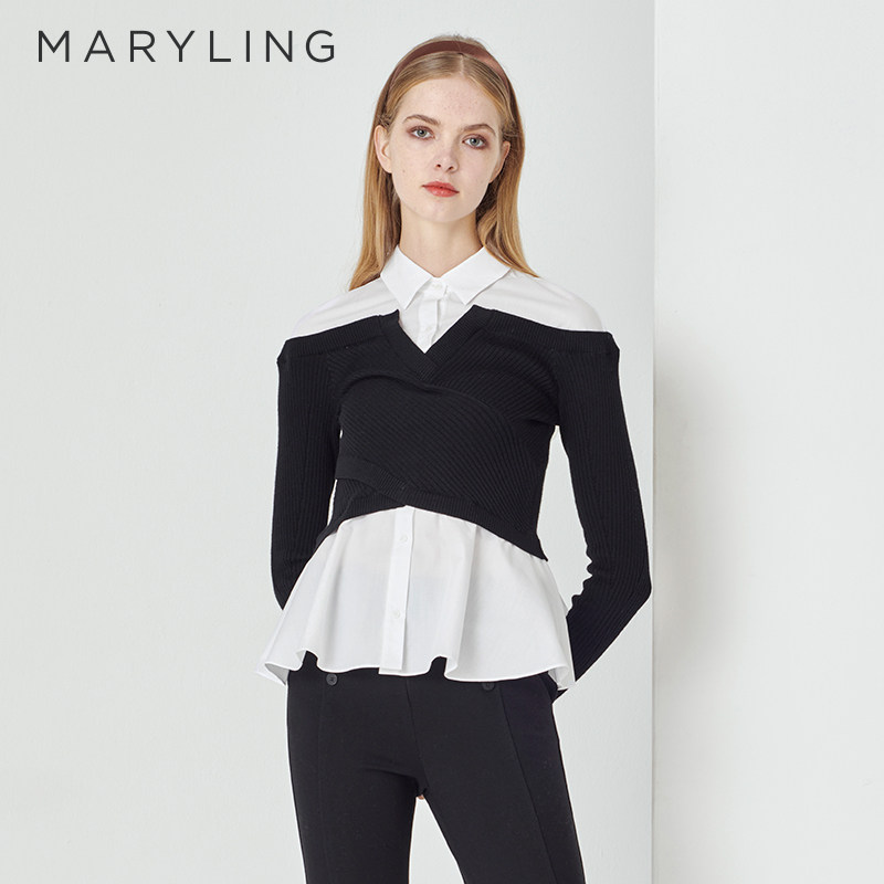 MARYLING玛俪琳秋新品经典黑白撞色针织假两件衬衫polo领百搭上衣
