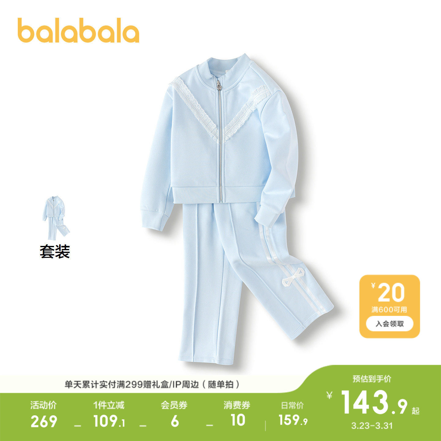 巴拉巴拉童装女童卫衣套装春装针织两件套蝴蝶结蕾丝时尚甜美百搭