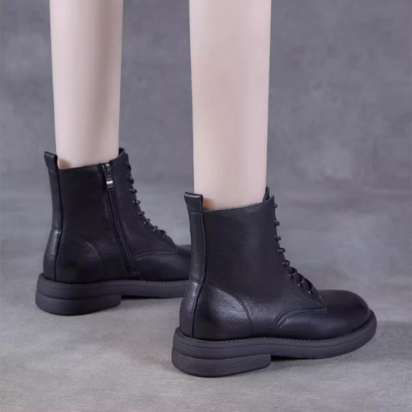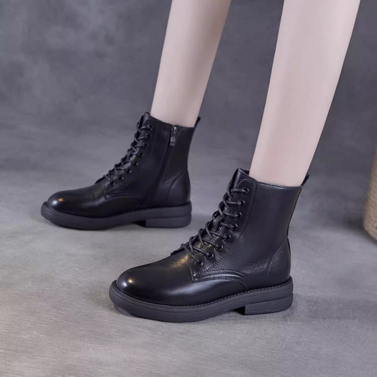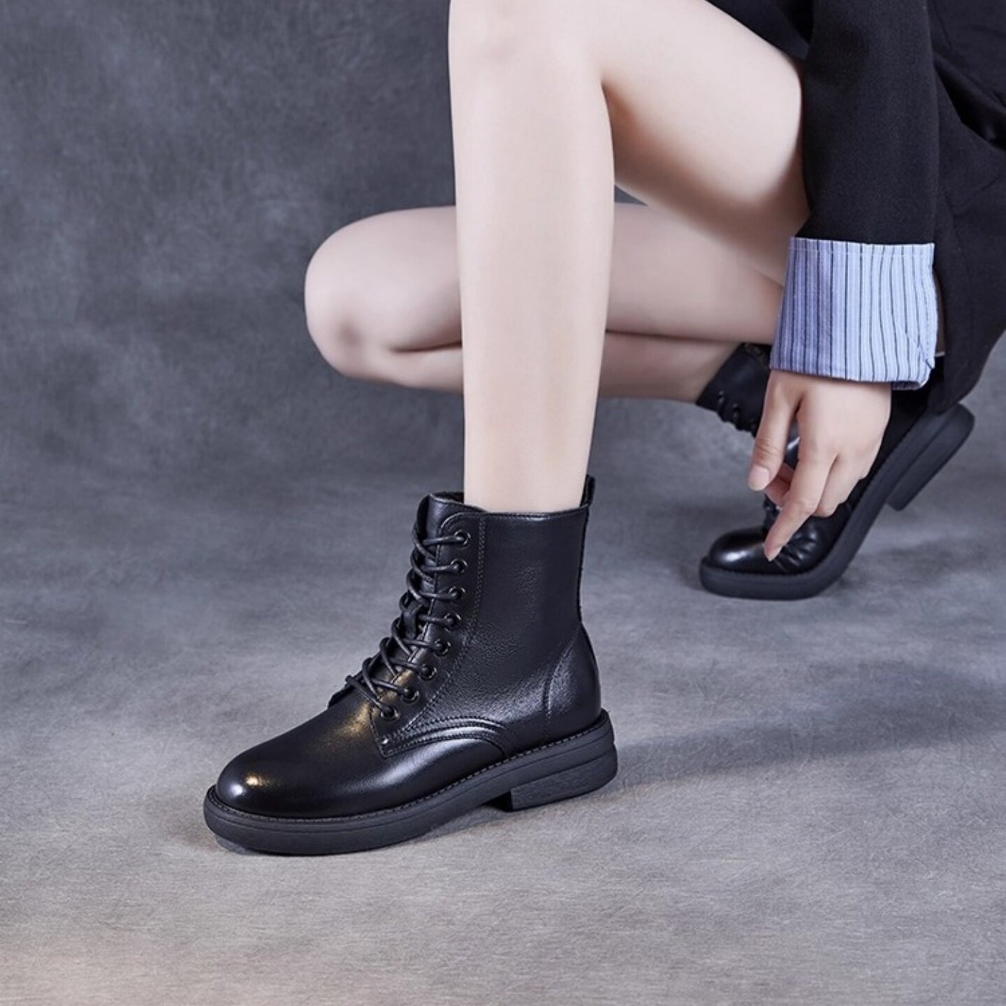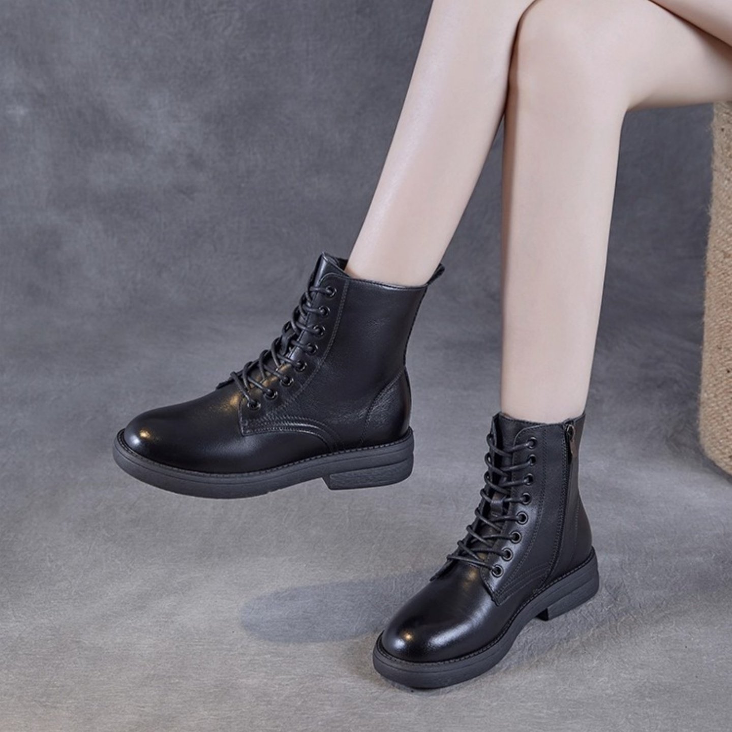 品牌真皮马丁靴女2025新款春秋时尚百搭平底女靴黑色牛皮平跟中跟