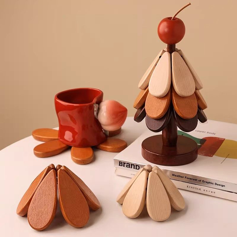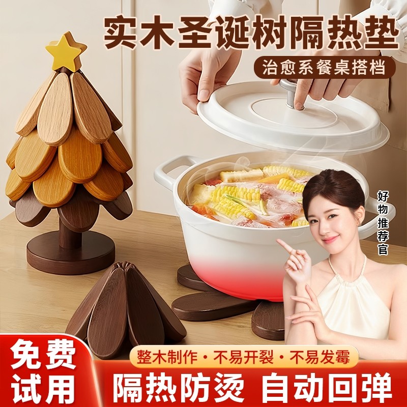 高级感圣诞树隔热垫餐垫摆件创意实木防烫锅垫折叠杯垫碗垫家用