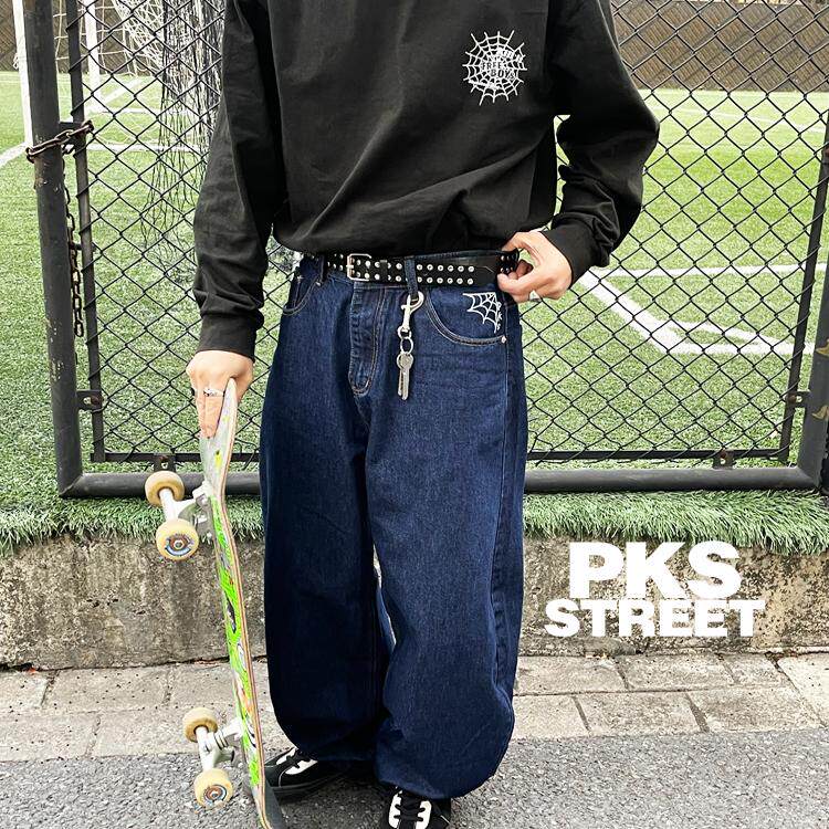 PKS蜘蛛网滑板直筒阔腿水洗牛仔裤街舞宽松老爹裤牛仔长裤气球裤