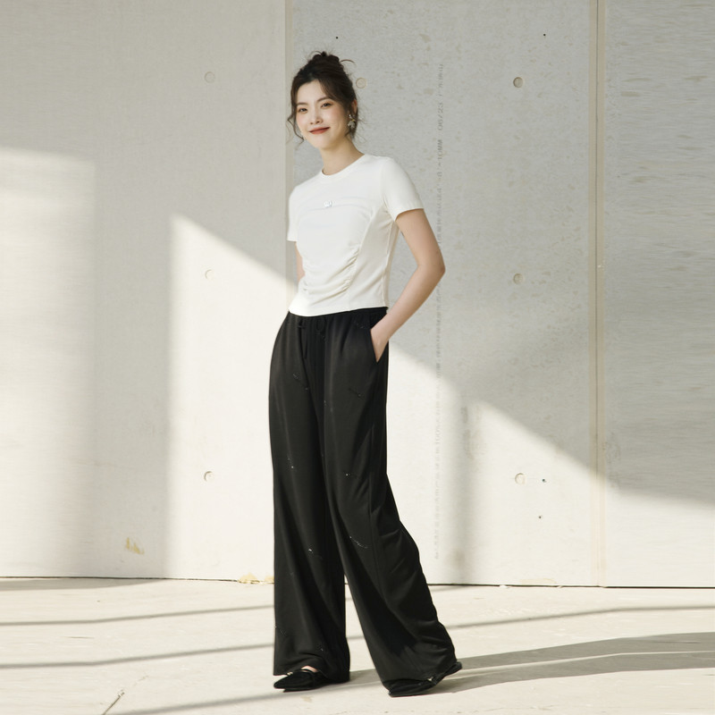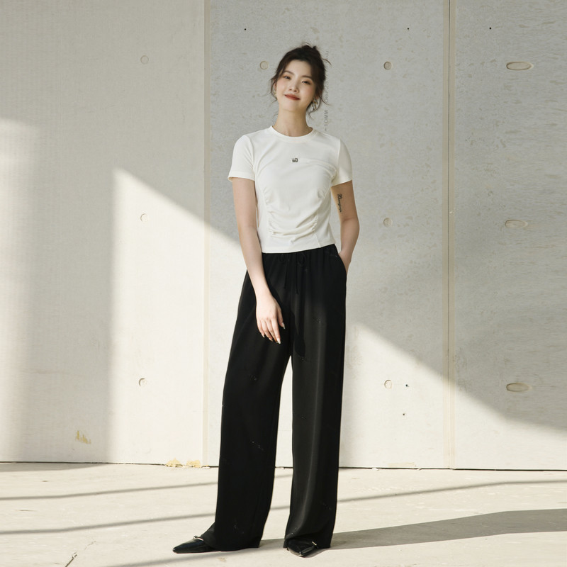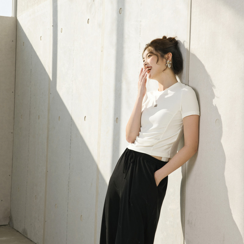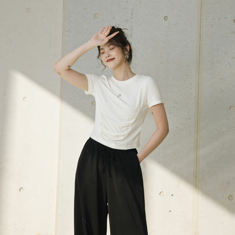 婉甸2025夏季新品月光白坑条短袖T恤圆领抽褶短袖1242T03SXA