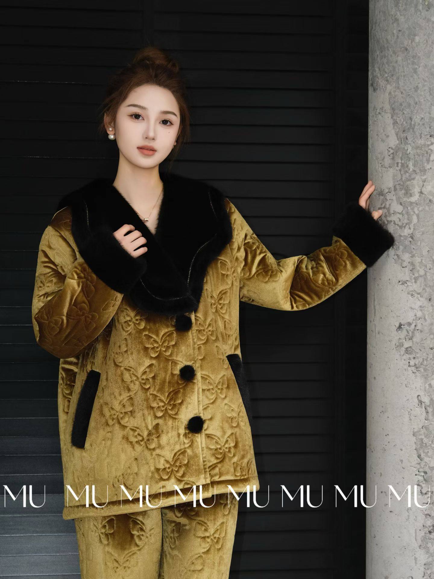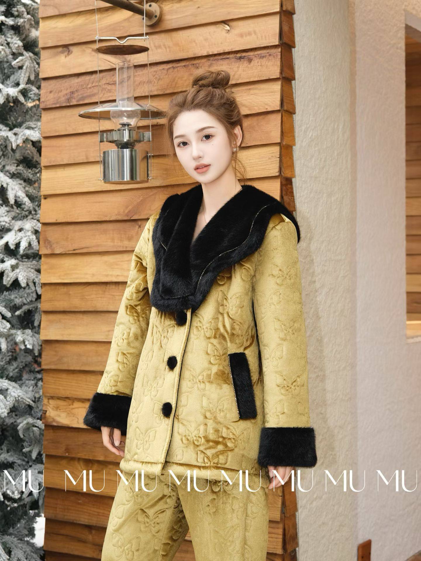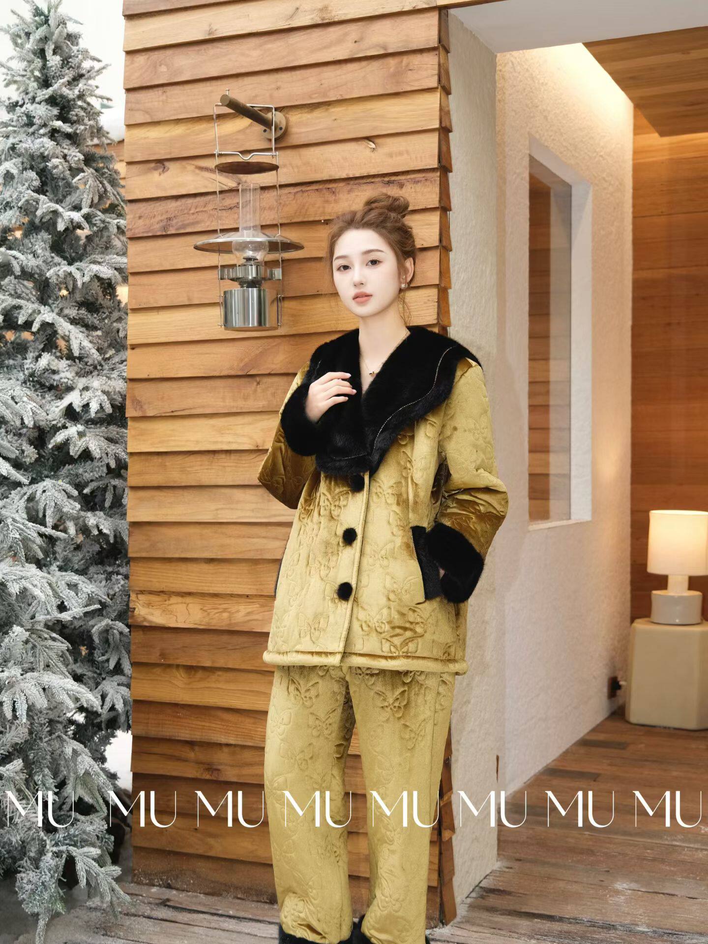 原艾慕优暮色溜金冬季加厚可外穿三层夹棉加绒加厚可外穿睡衣套装