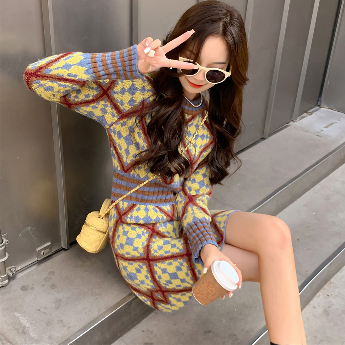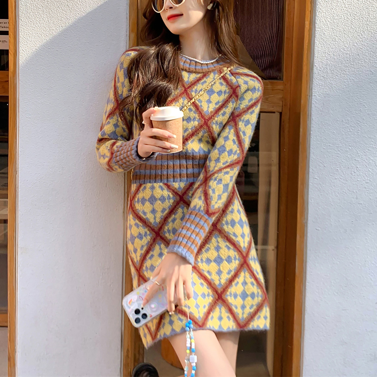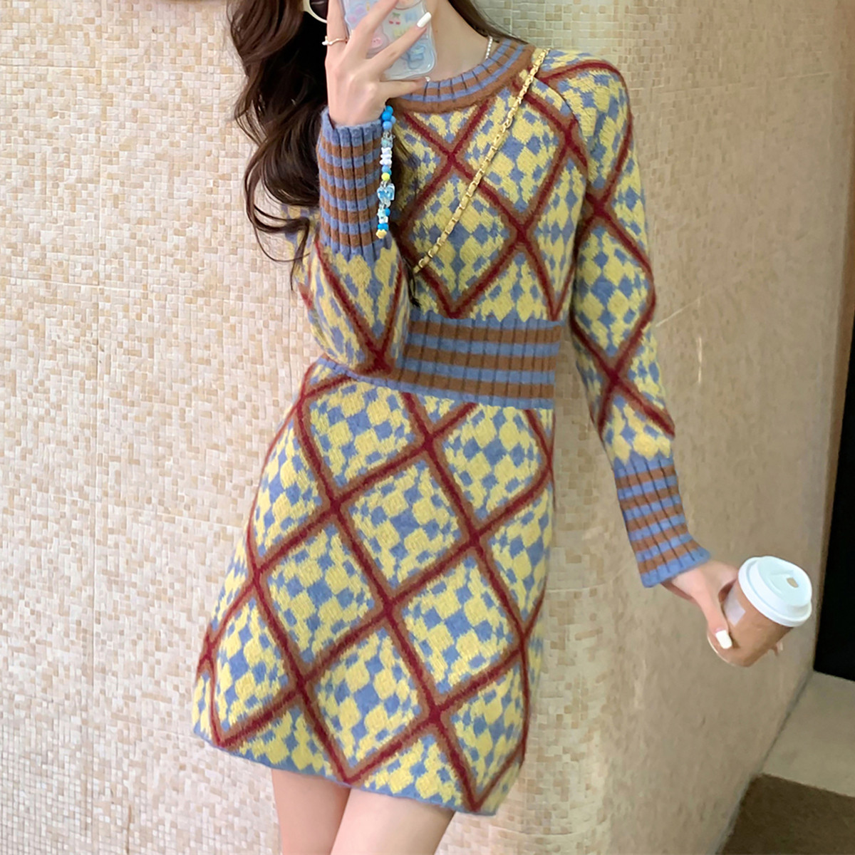 唐狮秋冬大牌风菱格图案显瘦连衣裙甜美风宽松超好看温柔系TM
