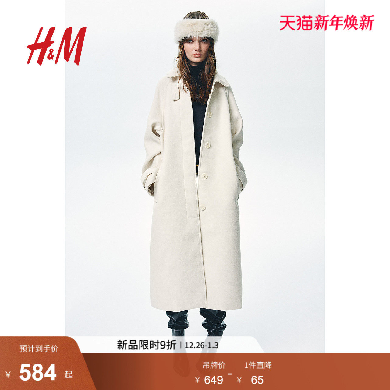 HM女装毛呢外套冬季保暖大廓形宽松翻领长款大衣1249582