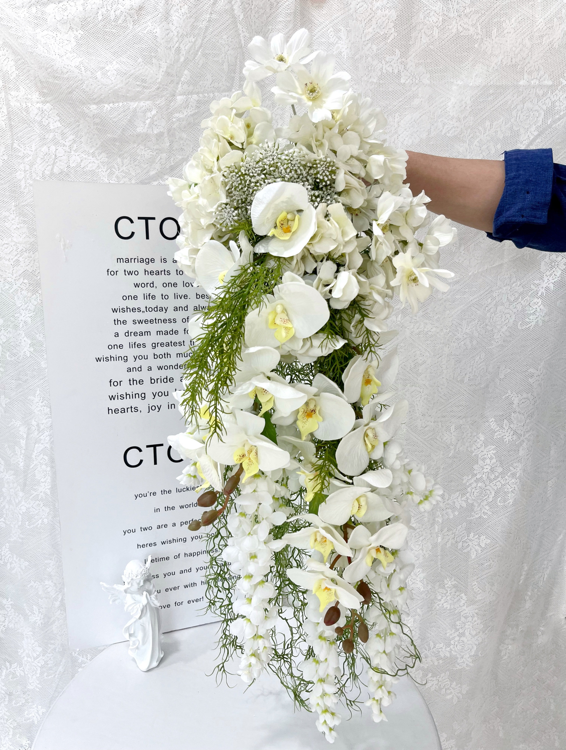 高级复古婚礼白色仿真花瀑布款手捧花新娘领证结婚花束拍照道具