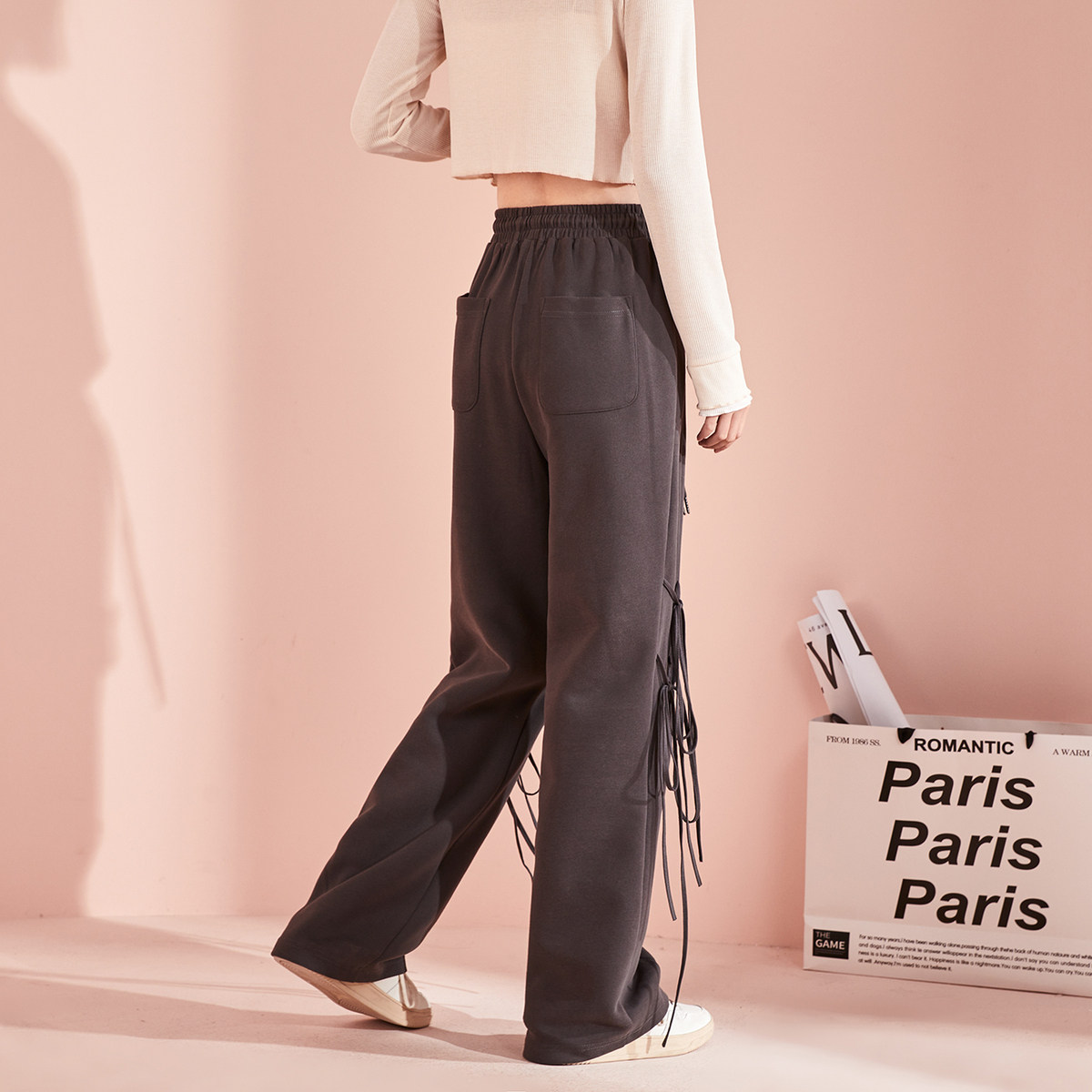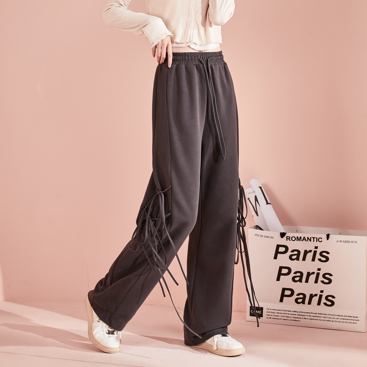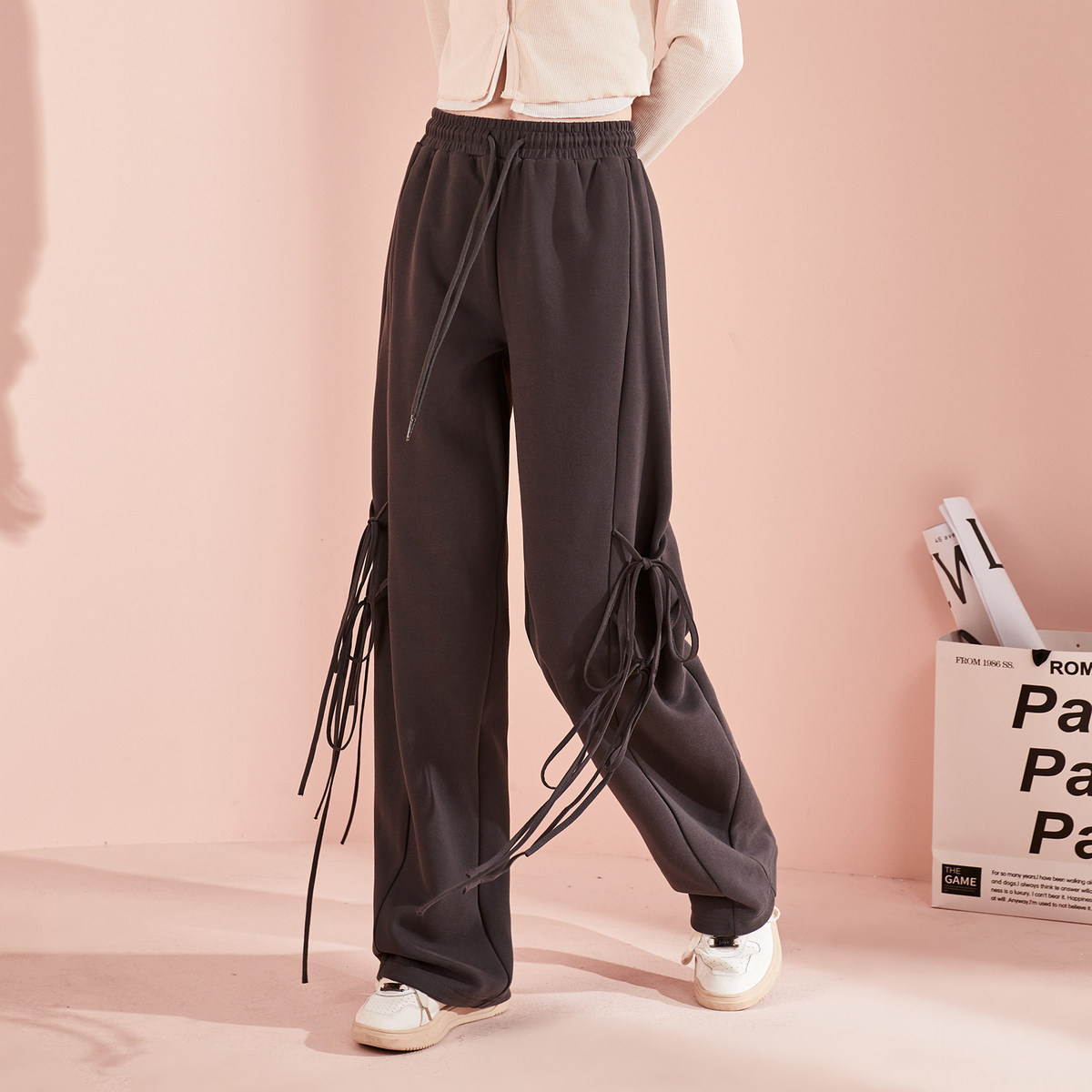 唐狮秋冬新款女休闲裤宽松直筒时尚绑带流行百搭阔腿灰色长裤TD