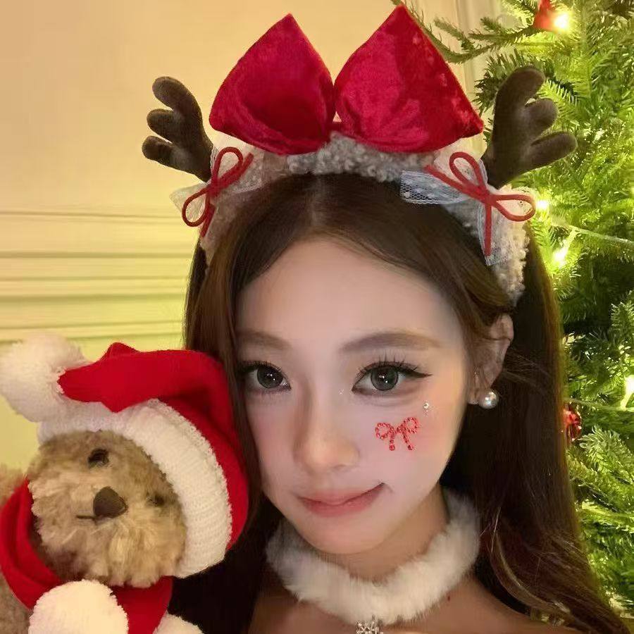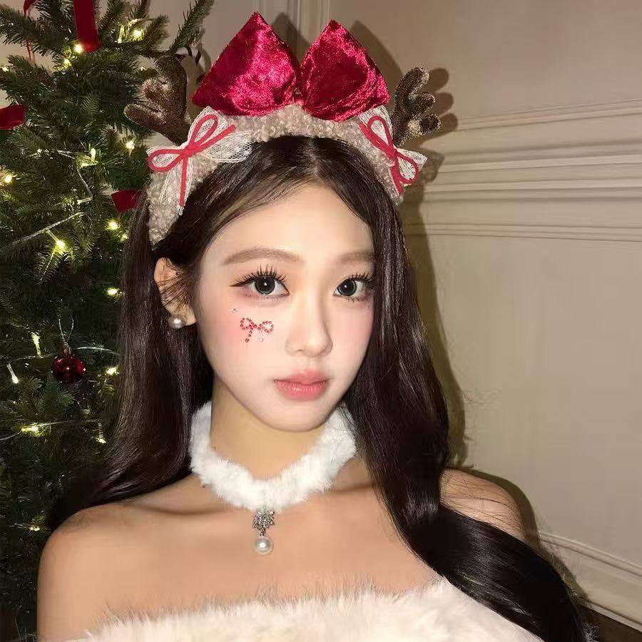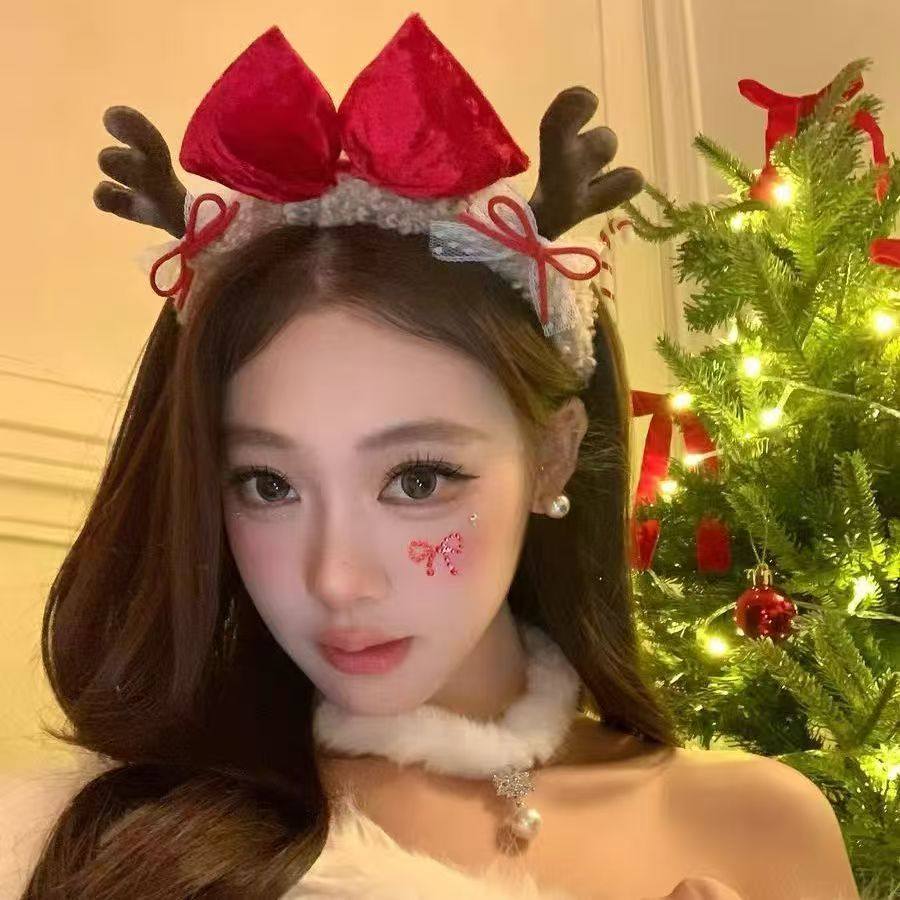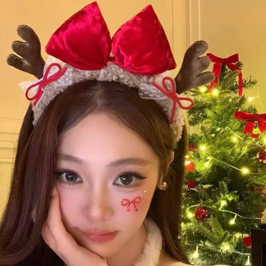 圣诞节装扮红色蝴蝶结麋鹿角毛绒发箍女氛围感拍照发饰头箍头饰