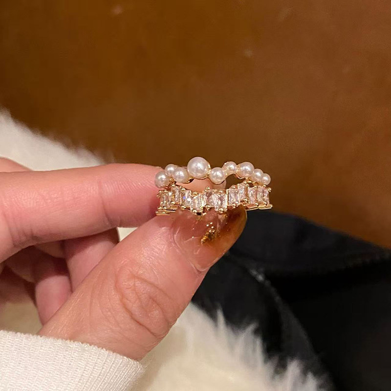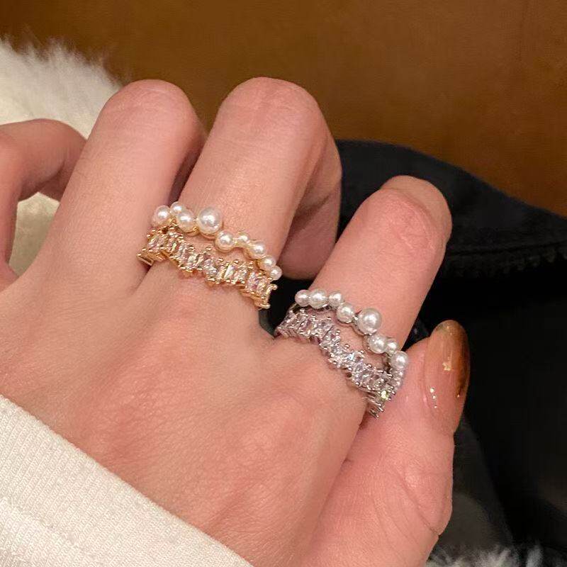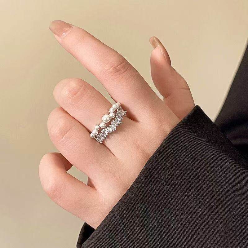 锆石珍珠双层金属开口戒指女轻奢复古显白精致时尚百搭指环戒指