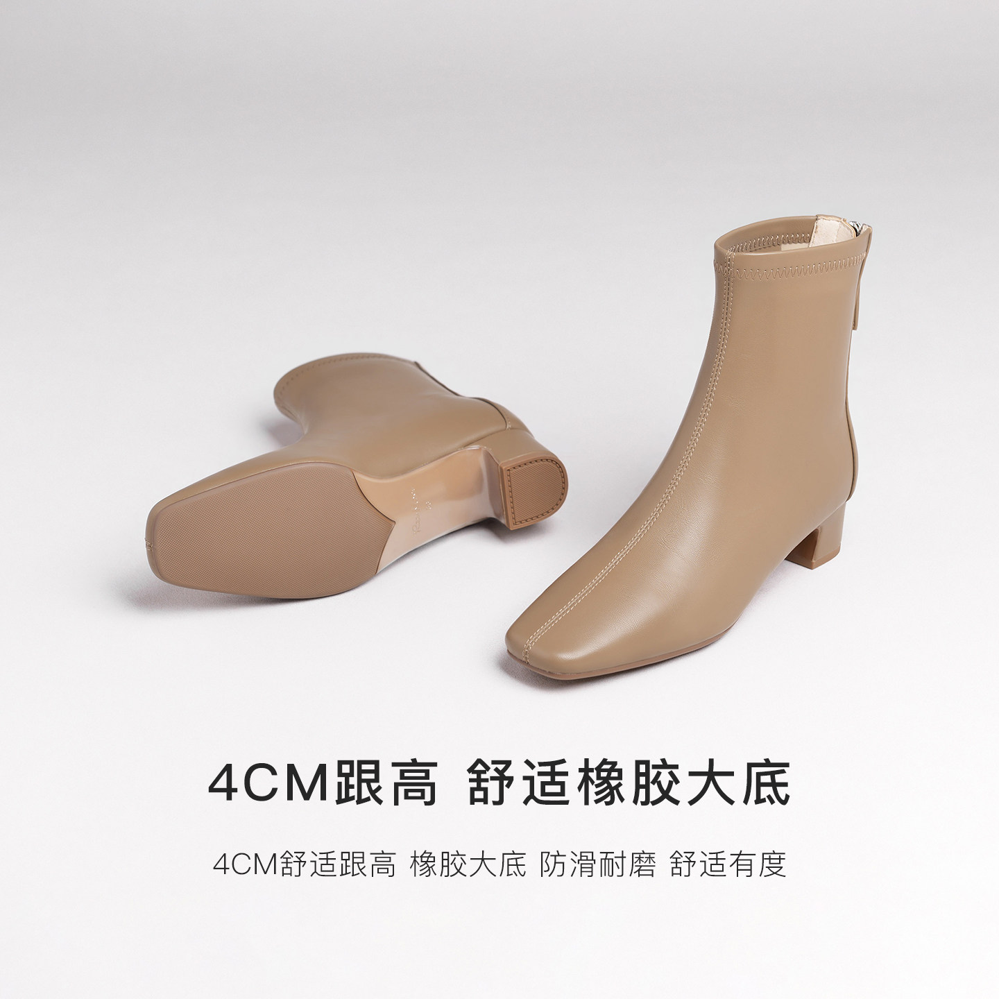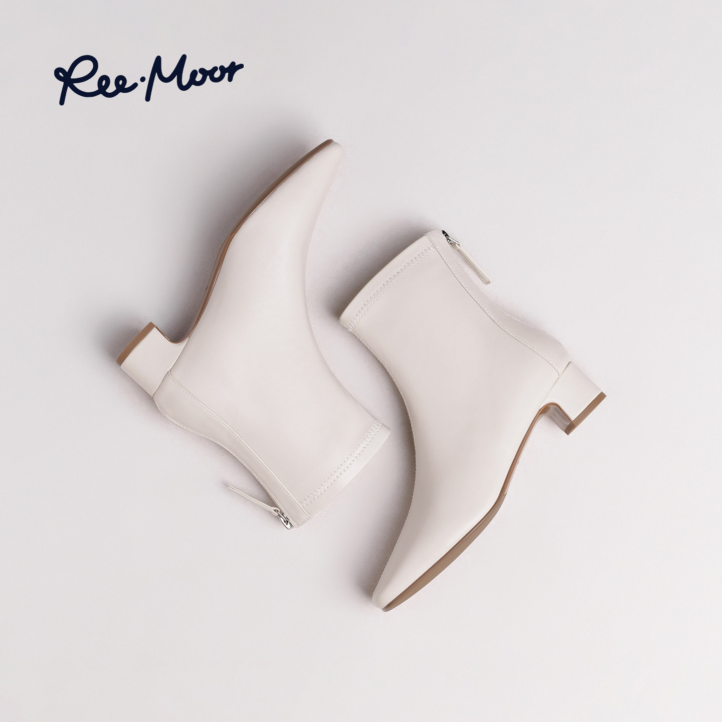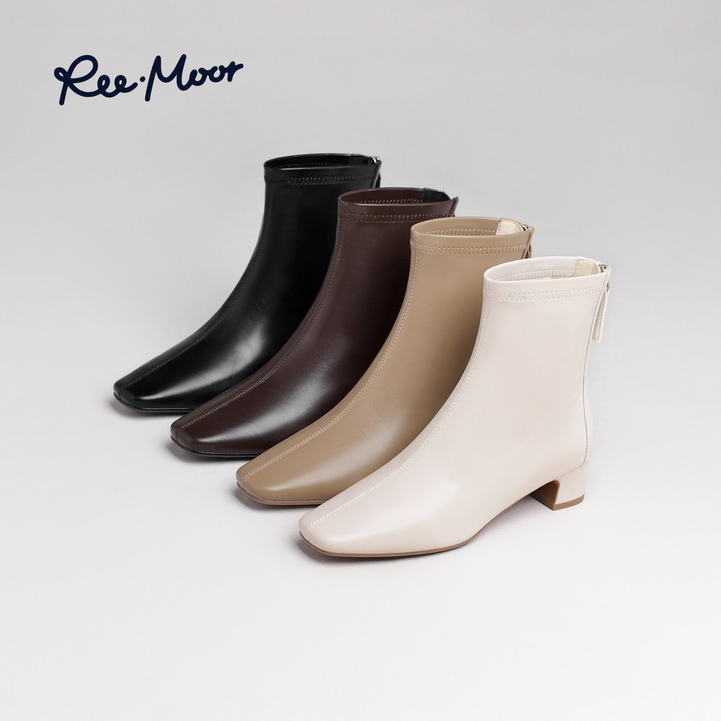 REEMOOR睿慕2025冬季新款法式方头瘦瘦靴女粗跟短靴显瘦舒适踝靴