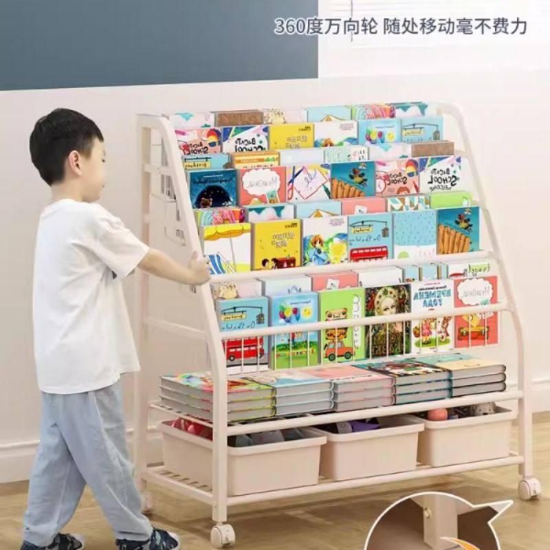 儿童书架置物架落地多层绘本架玩具收纳架家用简易书柜可移动带轮