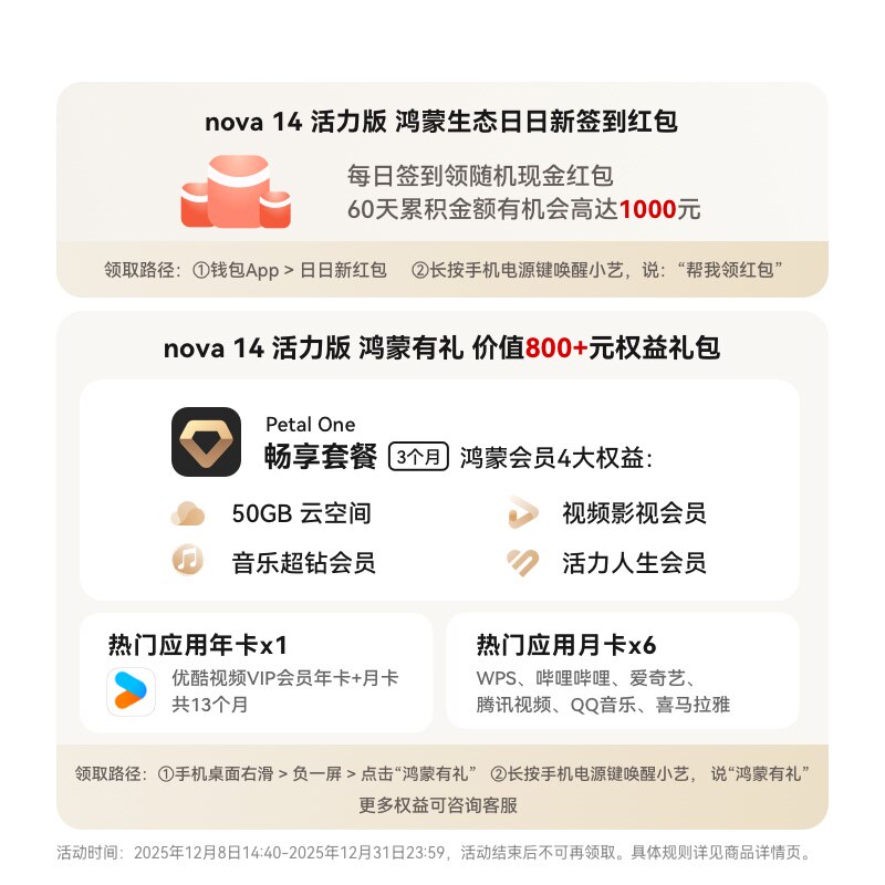 【优惠50元】华为nova 14 活力版新品前后双5000万超清影像鸿蒙安全纯净防诈鸿蒙智慧通信官方旗舰店智能手机