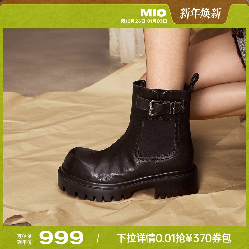 MIO米奥切尔西靴2025冬季新款圆头高跟褶皱感马丁靴复古增高女靴