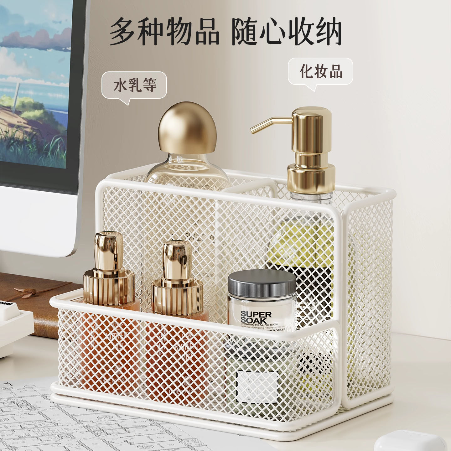 面膜收纳盒亚克力梳妆台透明分格盒桌面化妆品大容量护肤品置物架