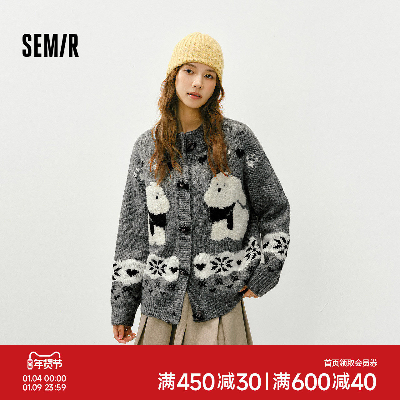 森马针织开衫女冬半高领小狗提花牛角扣毛衫宽松2025新款可爱上衣