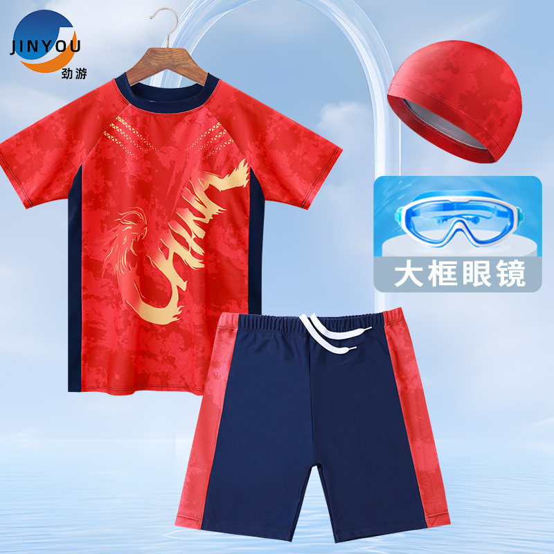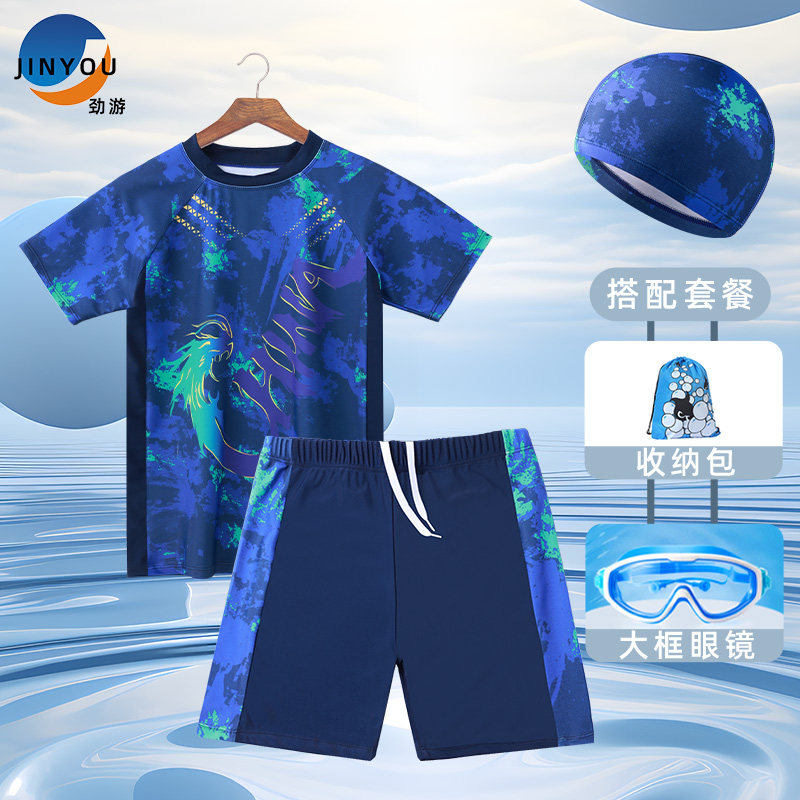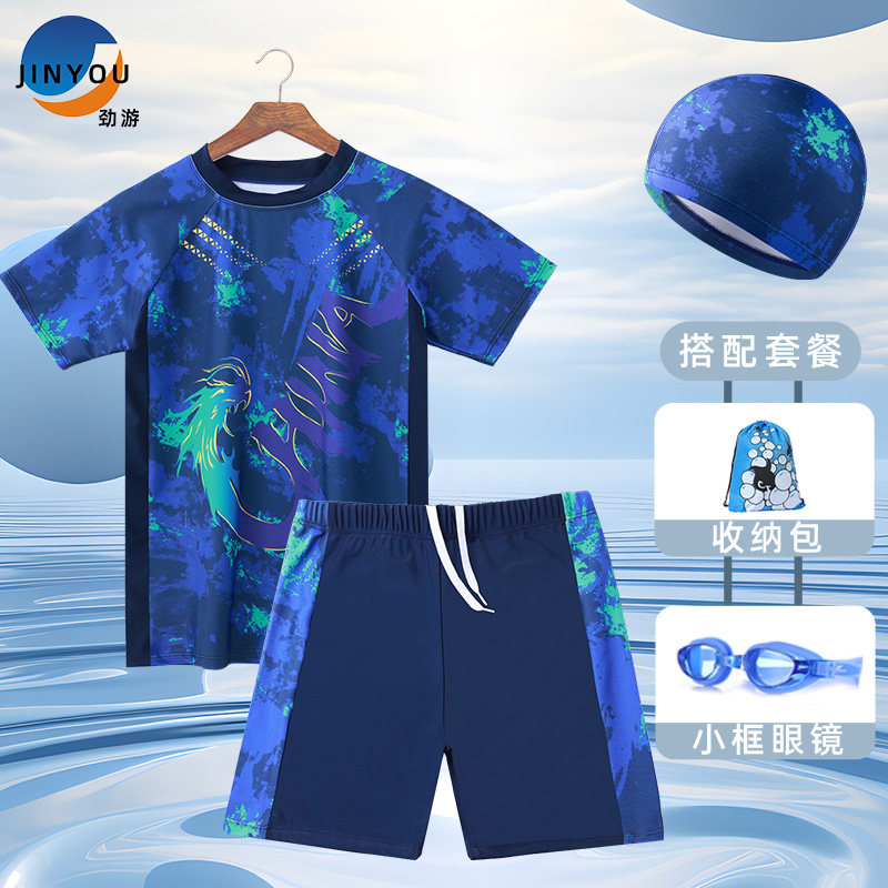 劲游儿童分体泳裤中大童胖男孩防晒速干游泳衣大码青少年套装