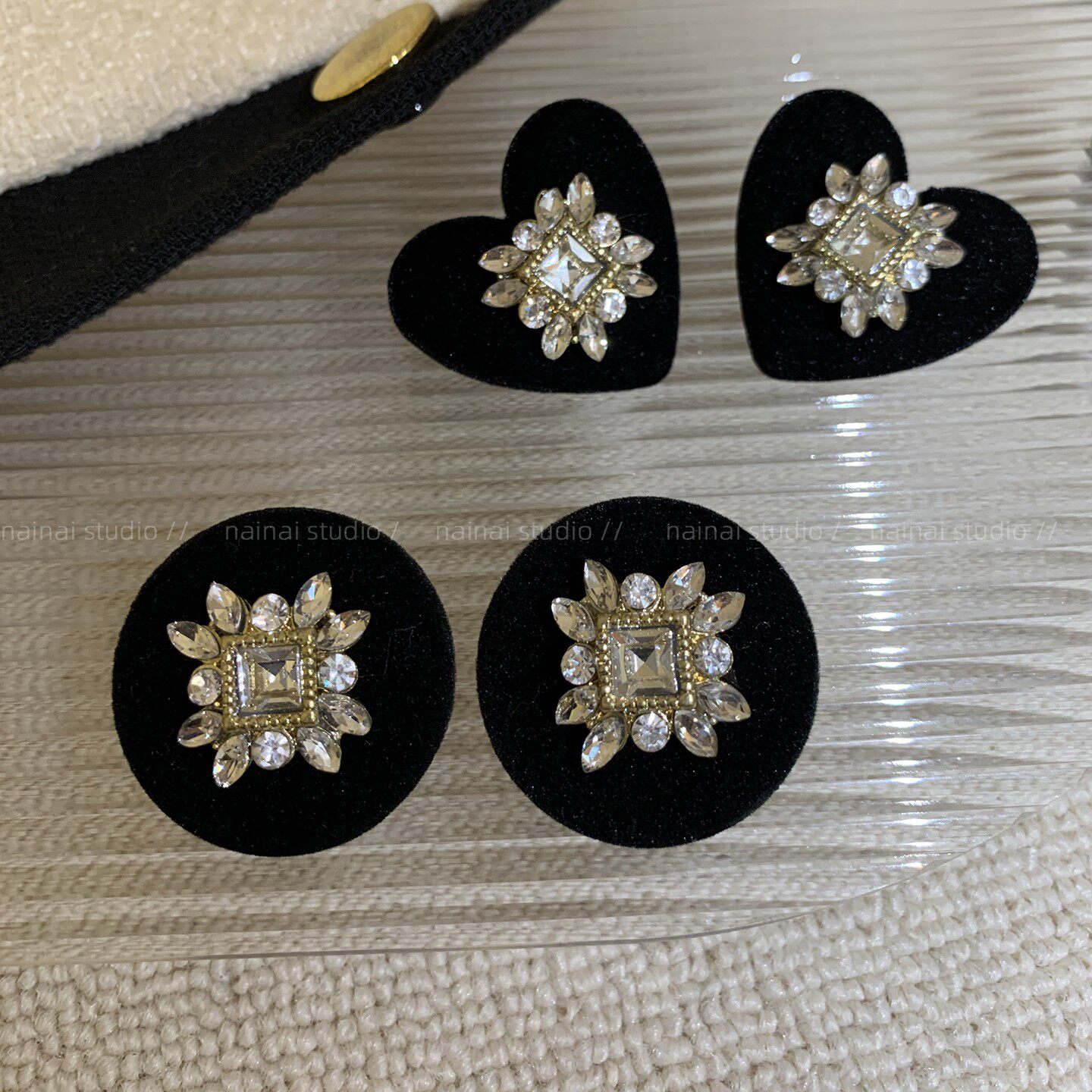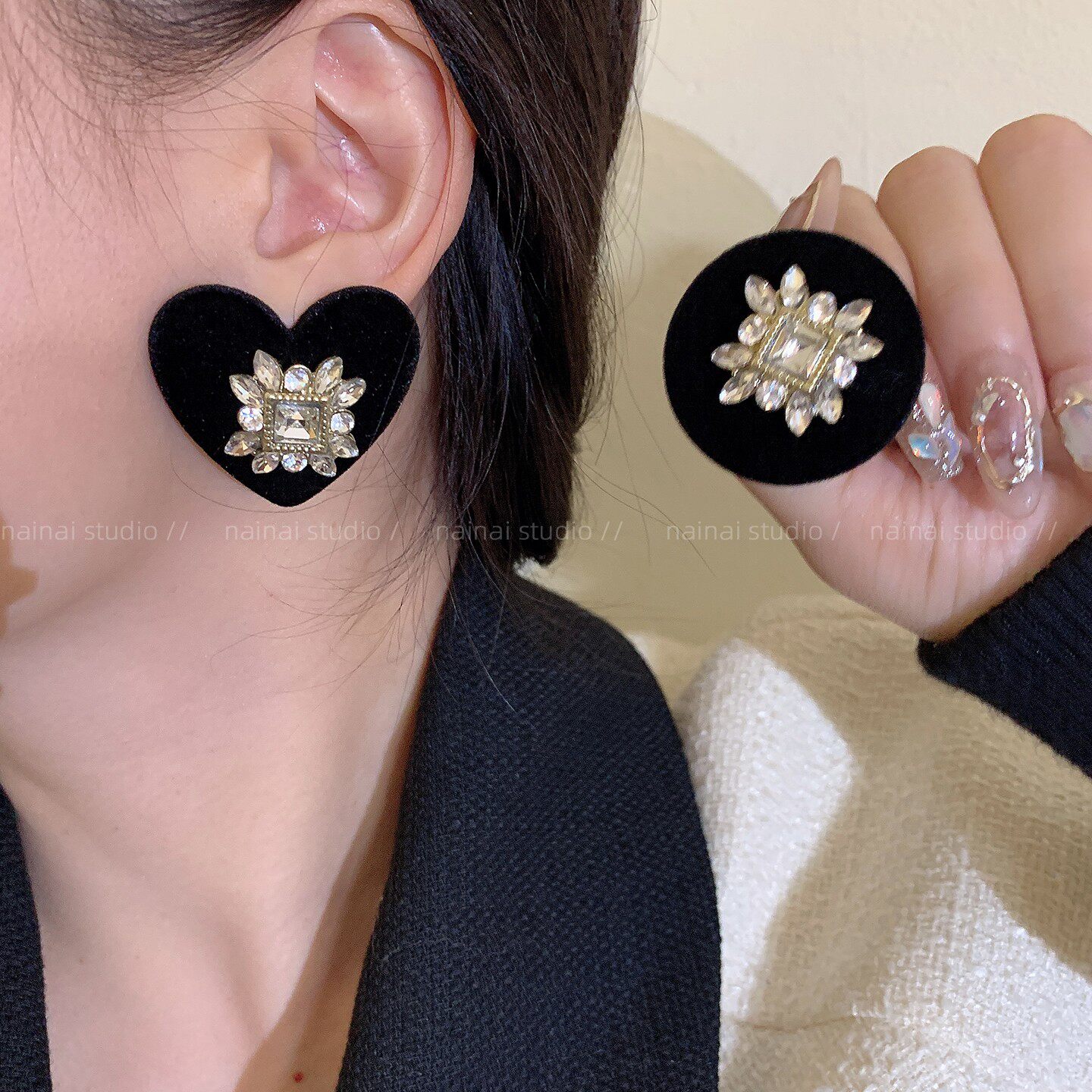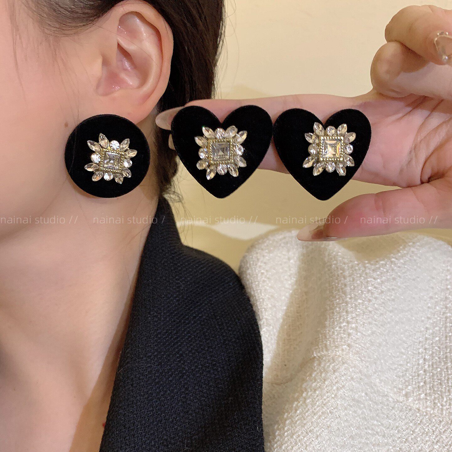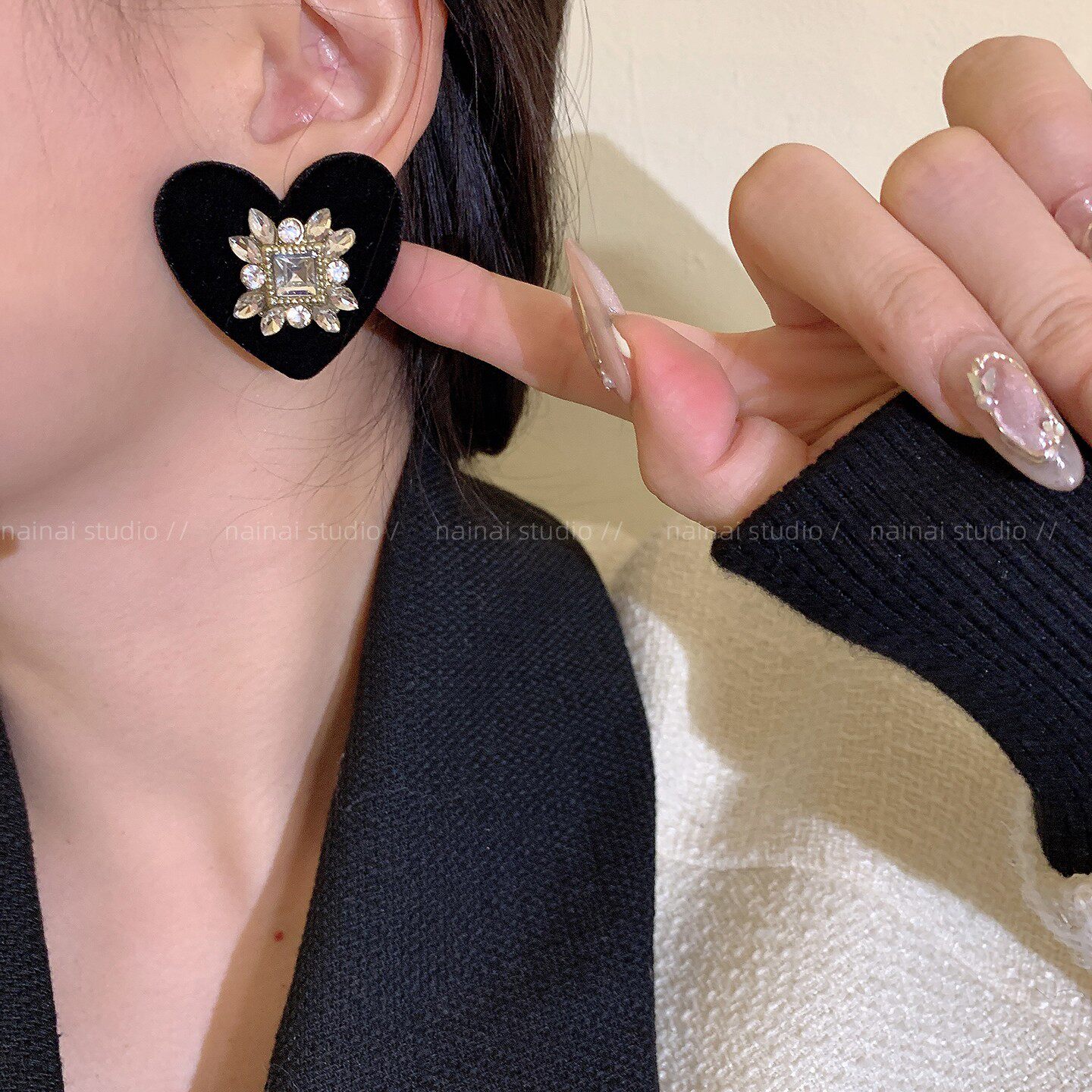 爱心闪钻耳环~黑色植绒高级感轻奢复古法式宫廷风耳钉气质耳饰女A
