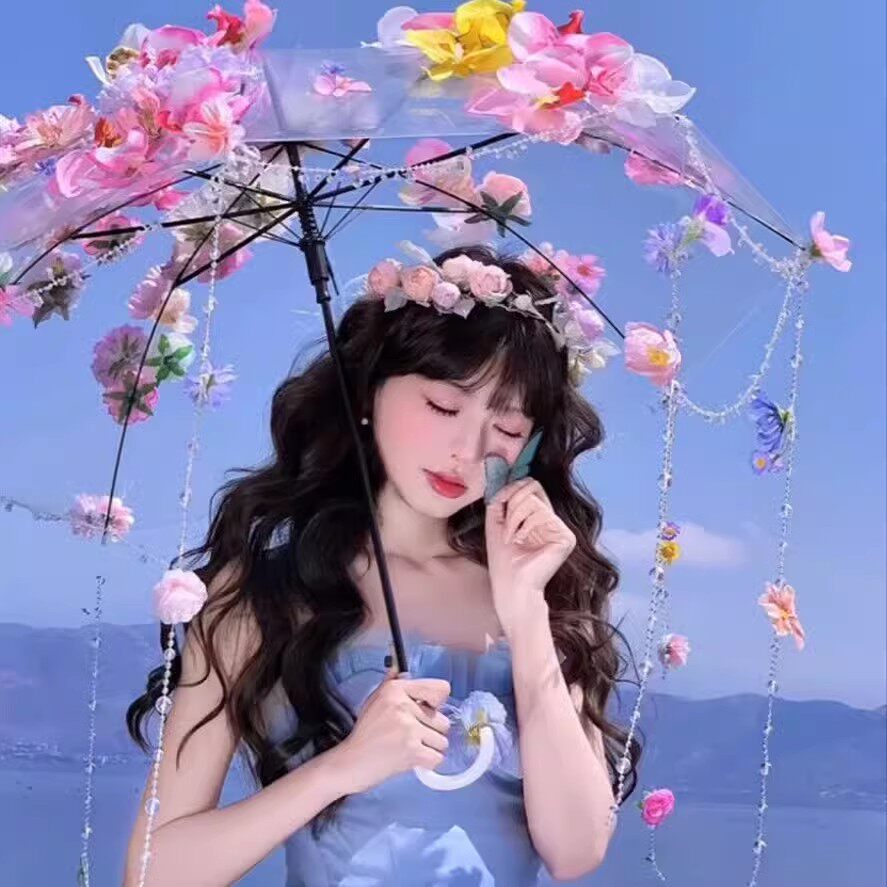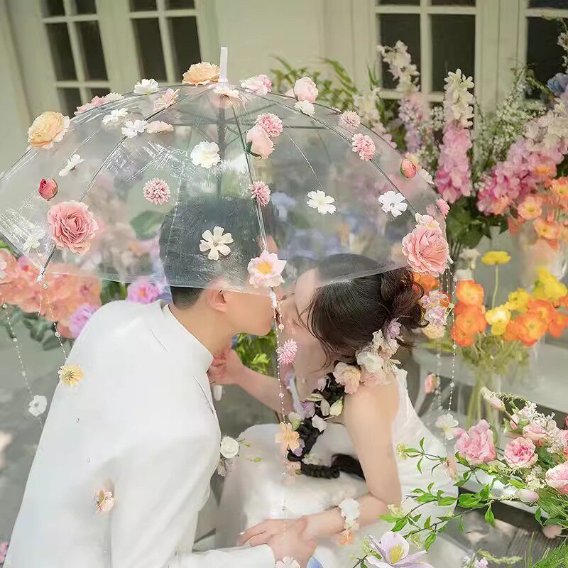 新款写真拍照道具花伞粘花透明伞小清新手拿伞婚纱摄影外景旅拍