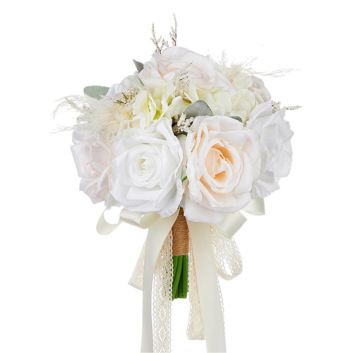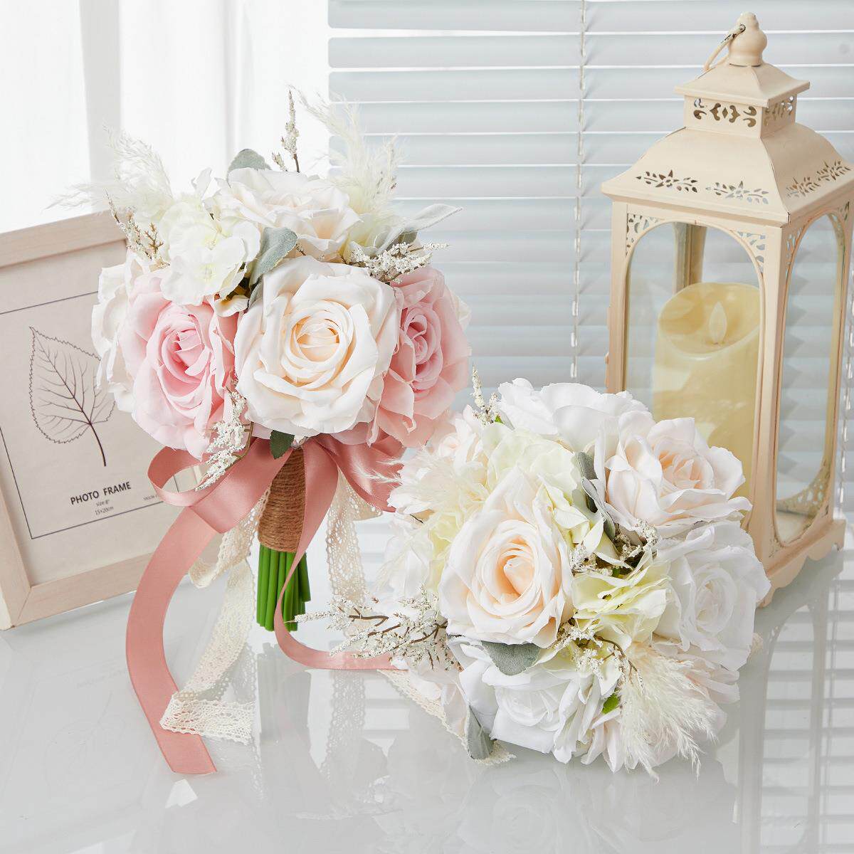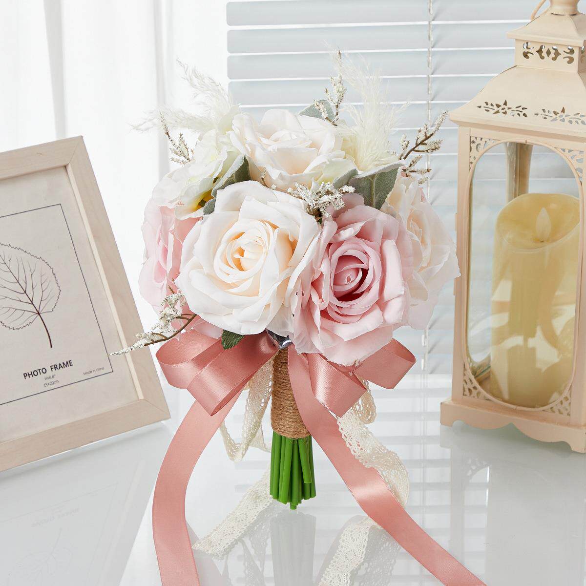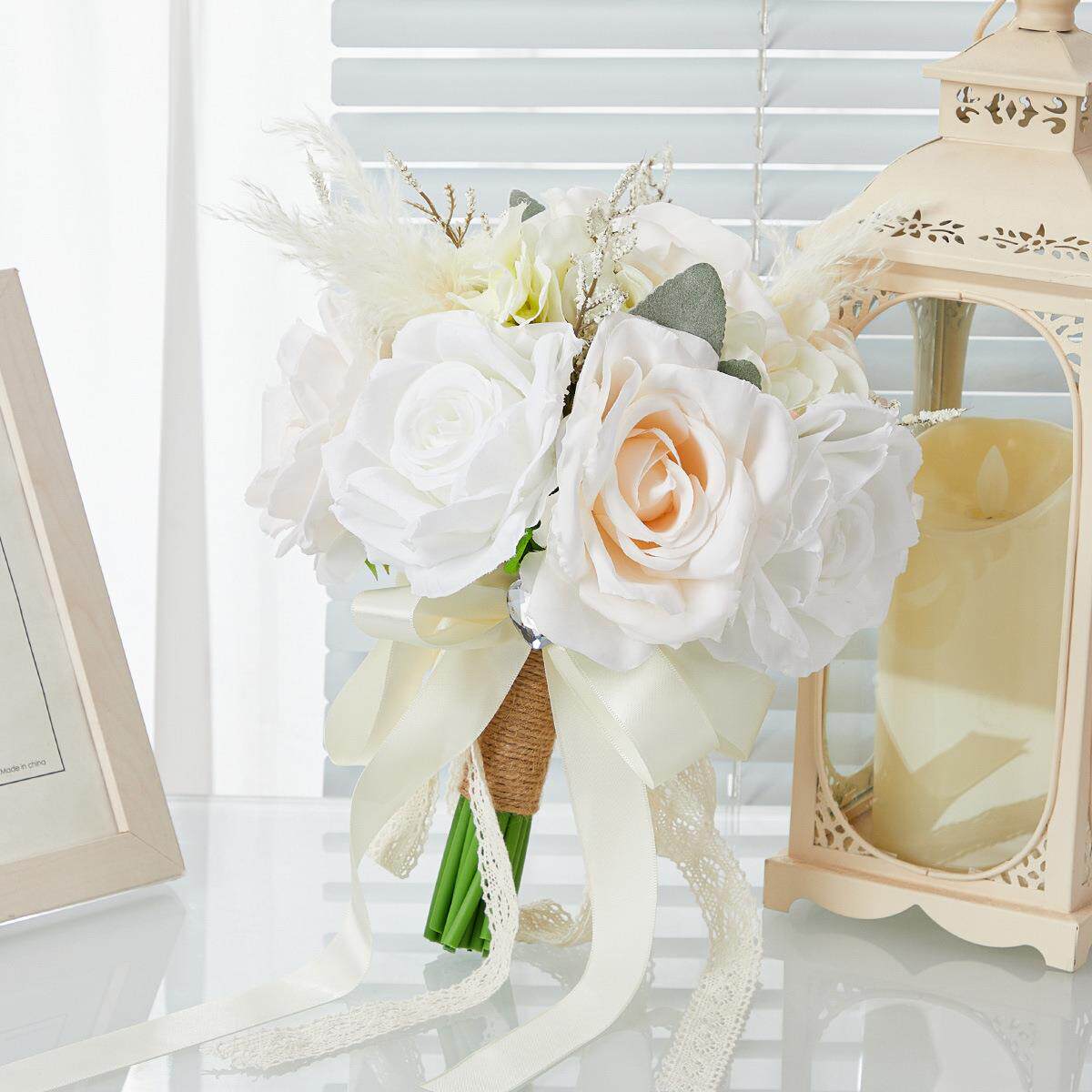 新款婚礼新娘手捧花香槟色玫瑰蝴蝶结流苏装饰仿真手捧花摄影道具