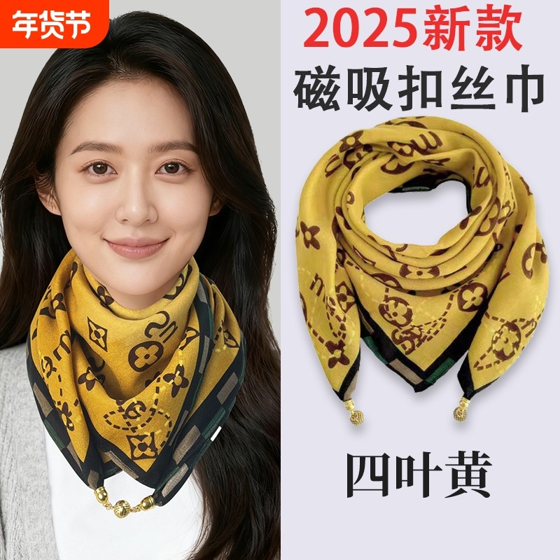 2025新款磁吸扣丝巾女秋冬薄款方巾护颈围巾围脖时尚百搭波点棉麻