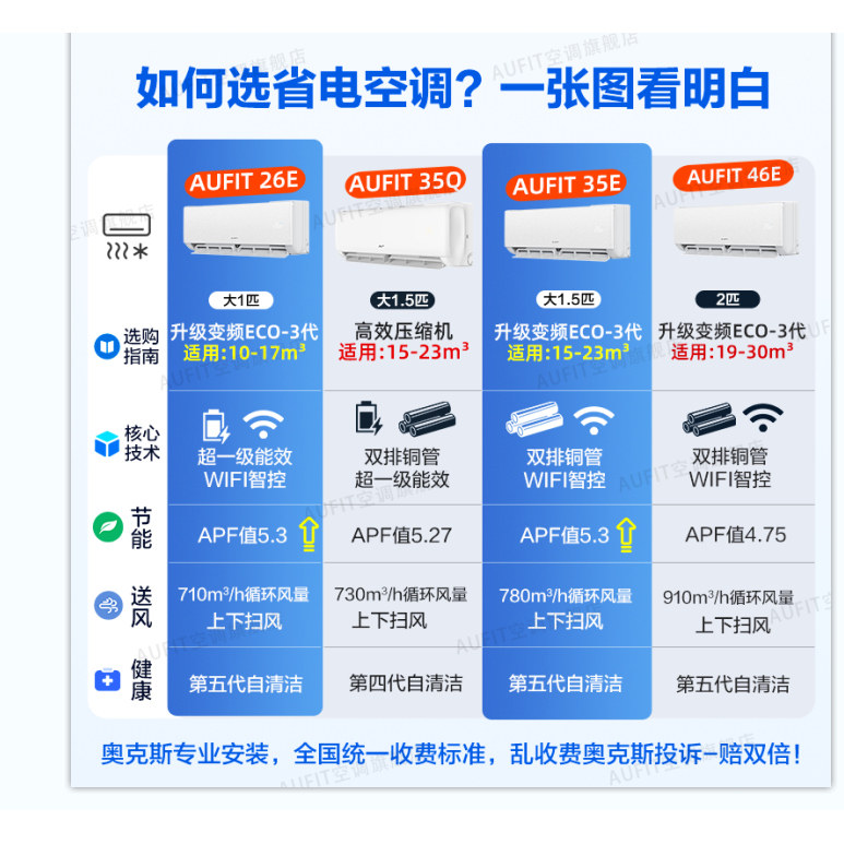 AUFIT空调奥克斯出品1.5匹挂机3匹立式柜机一级能效冷暖变频1/2匹