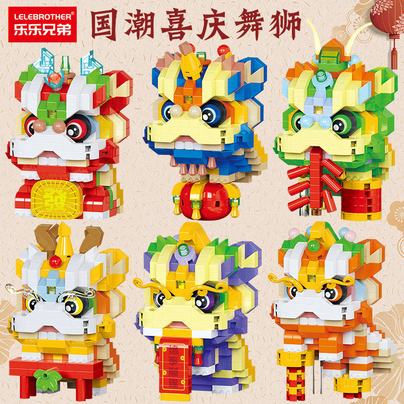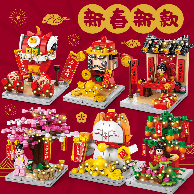 新春迎马年神兽玩具拼装招财猫拼插摇钱树积木春节中国风新年礼物