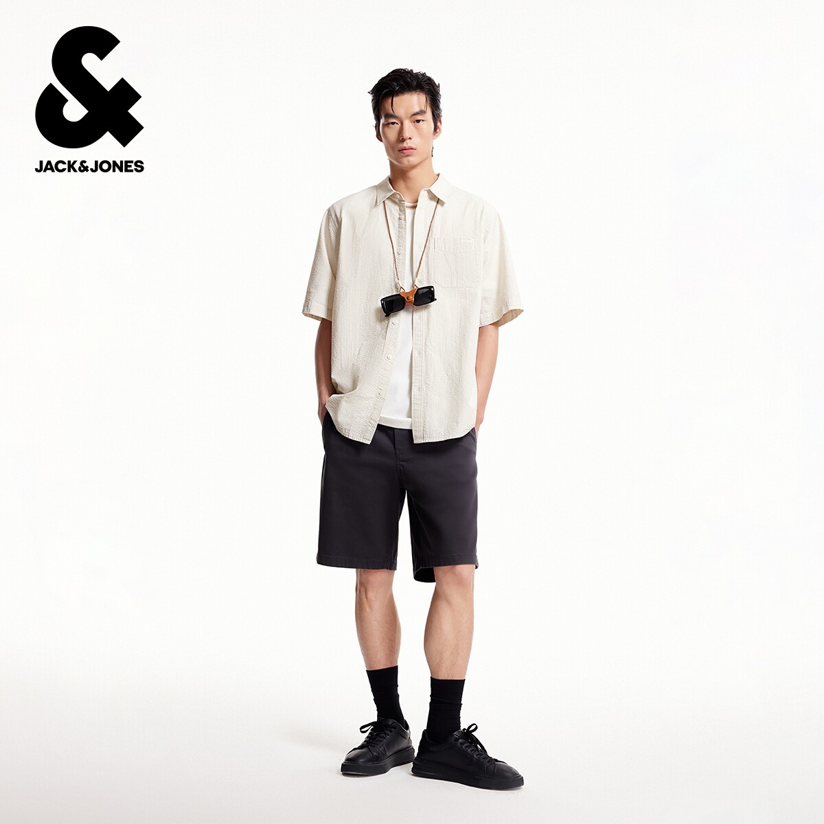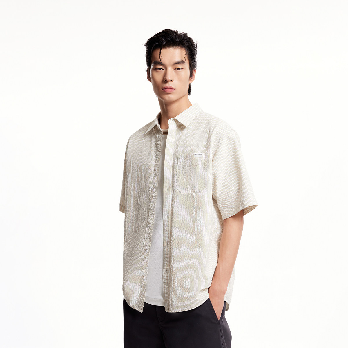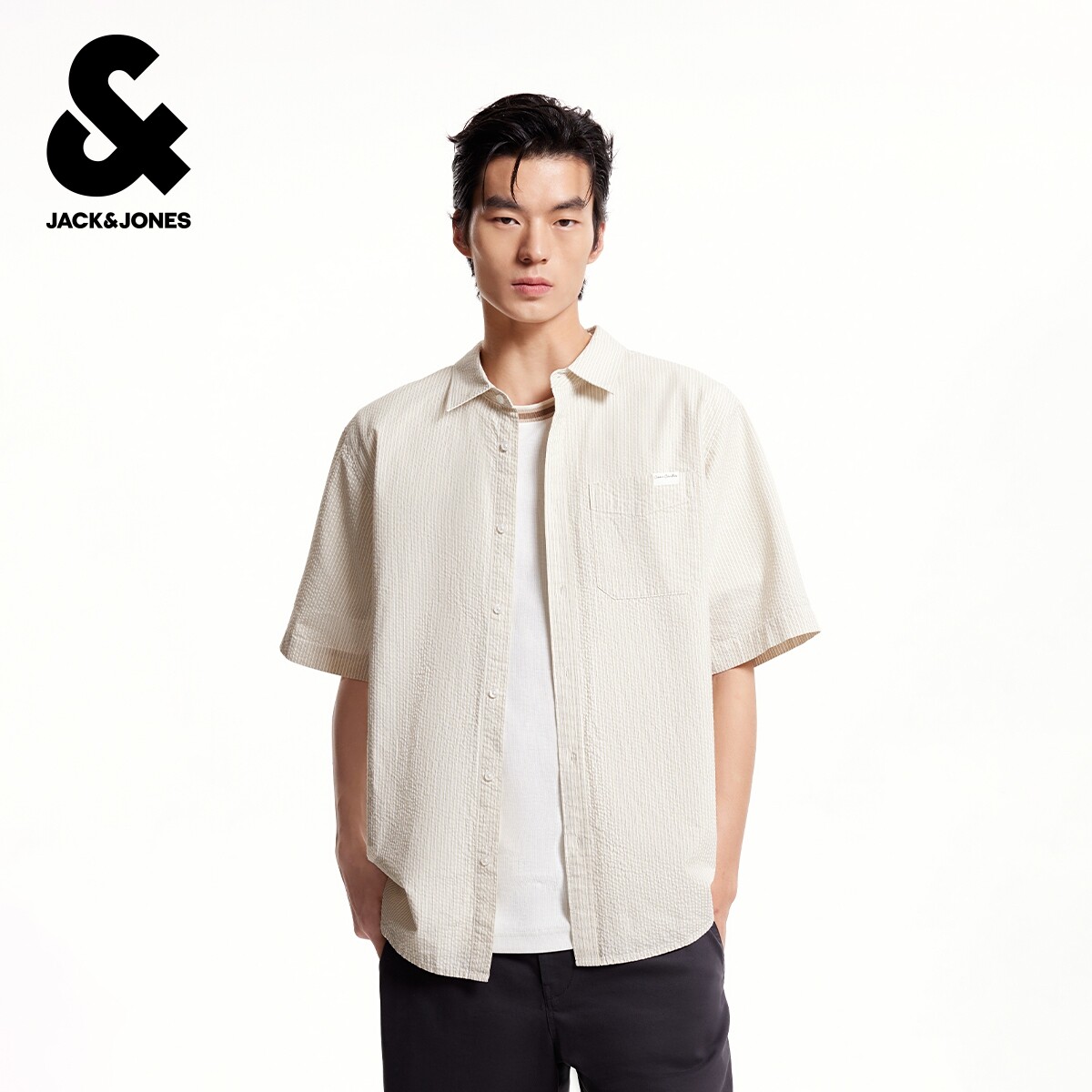 杰克琼斯男装秋季新款衬衫时尚百搭条纹宽松休闲翻领全棉短袖上衣