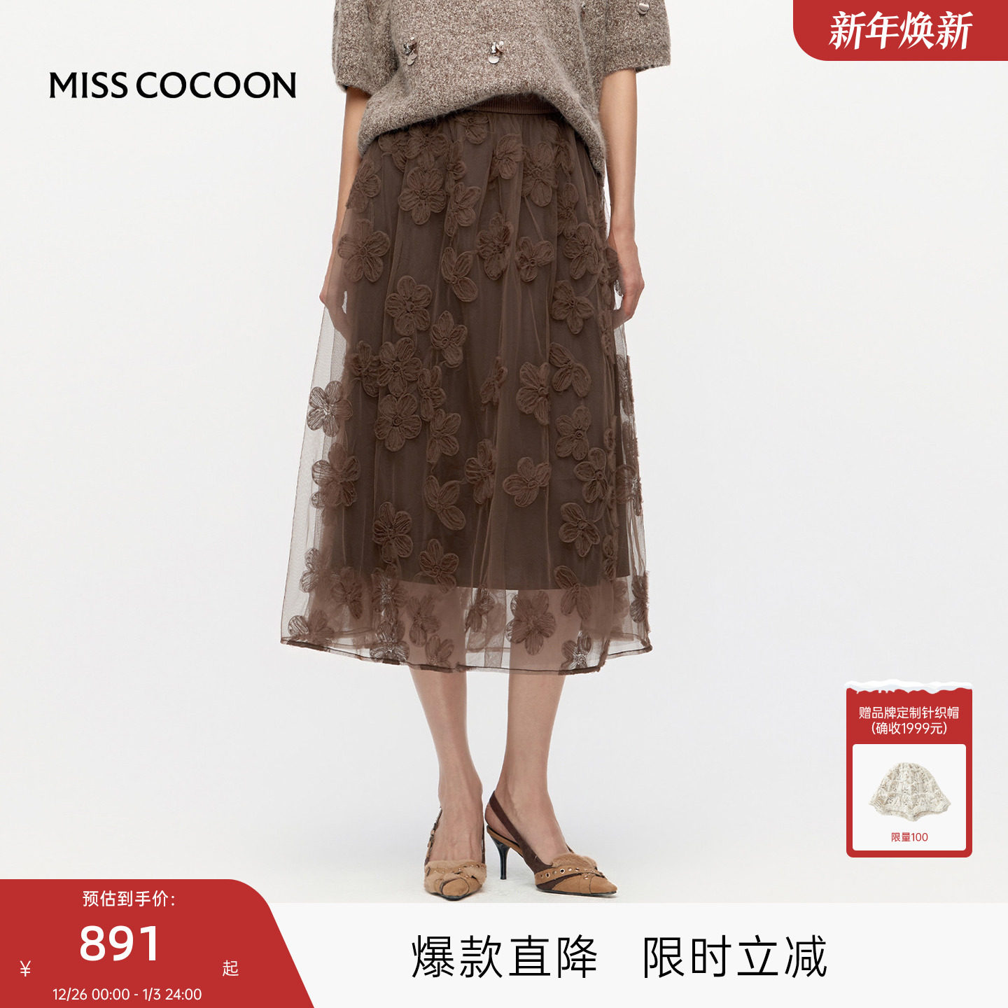 MISSCOCOON可可尼咖棕色蕾丝a字半身长裙女2025冬新款网纱感裙子