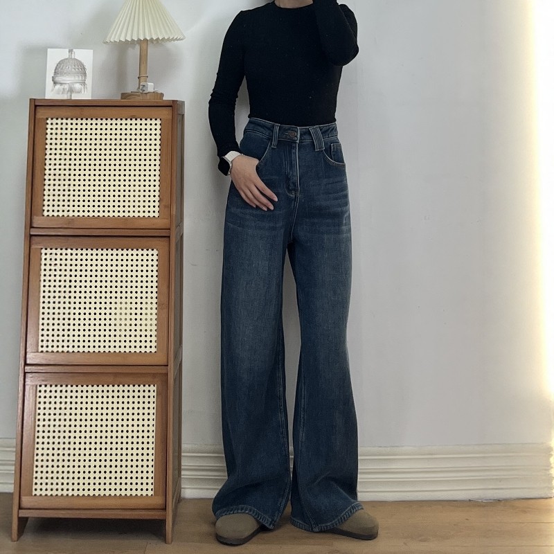 王家有鱼加绒小个子复古蓝直筒阔腿裤女2025年秋冬新款百搭牛仔裤