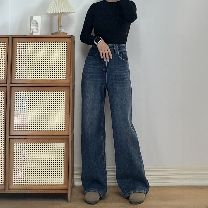 王家有鱼秋冬新款加绒阔腿裤2025百搭修身显瘦宽松直筒牛仔裤子女