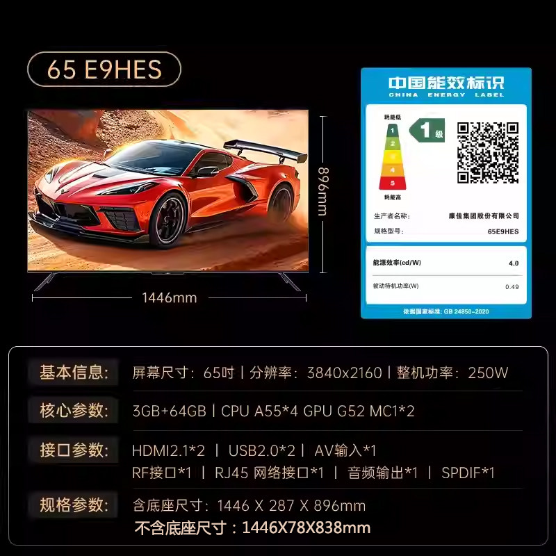康佳65英寸E9HES新1级能效288HZ智能语音高刷4K网络游戏护眼电视