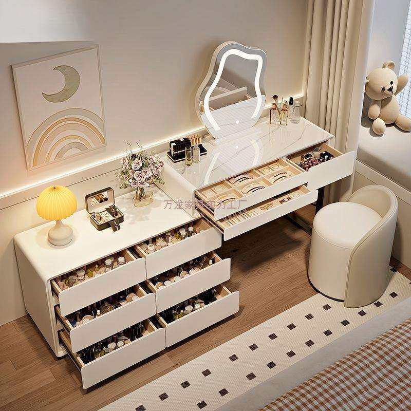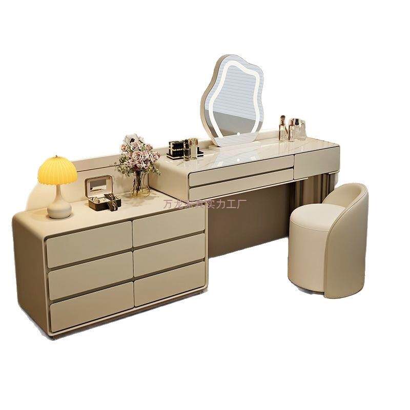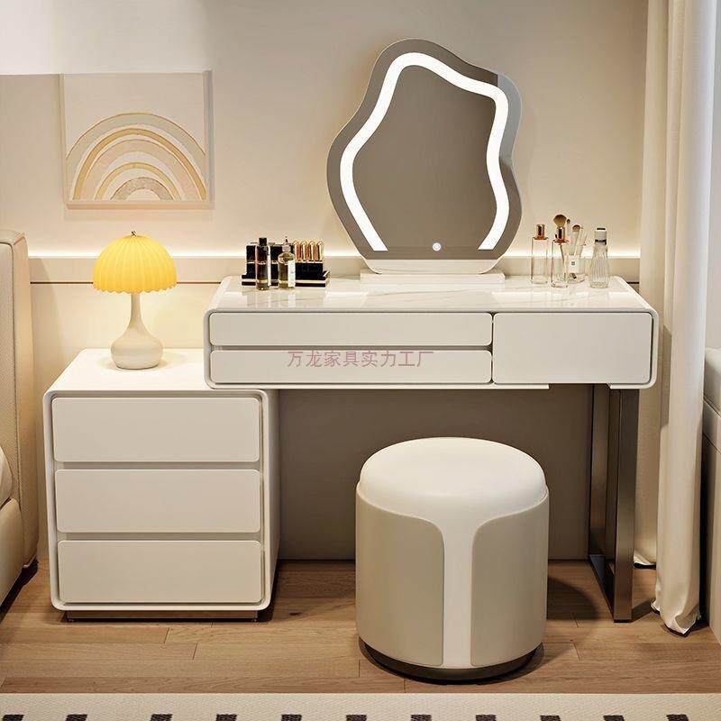 2025新款奶油风实木梳妆台斗柜一体极简小型化妆镜岩板桌面化妆台