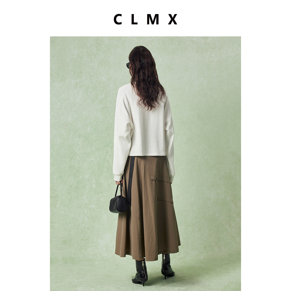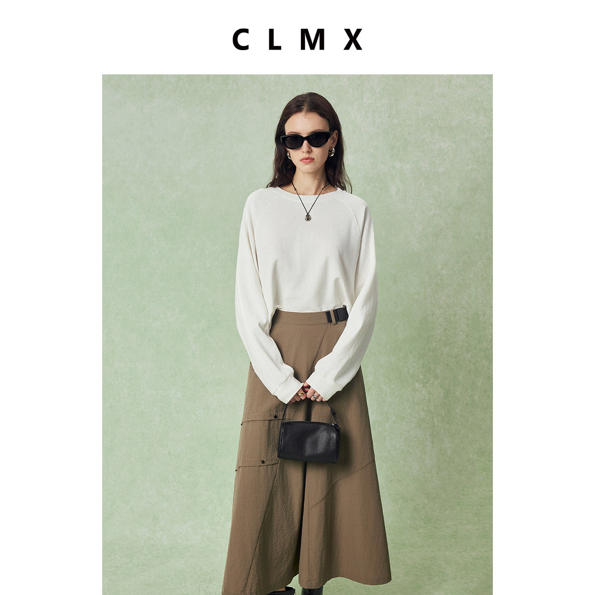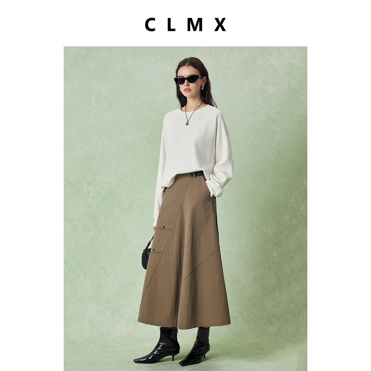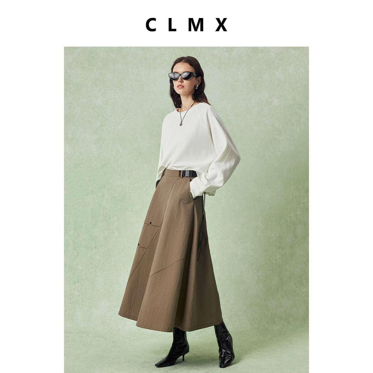 CLMX自然水洗皱缩工艺亚麻面料 时髦工装风腰带斜线分割A摆半裙
