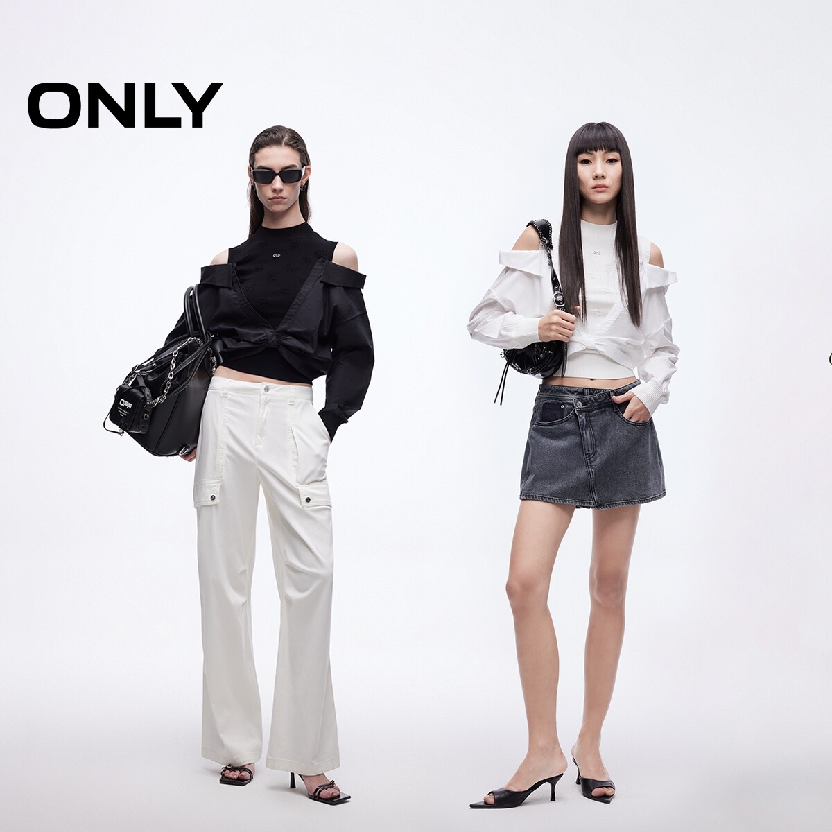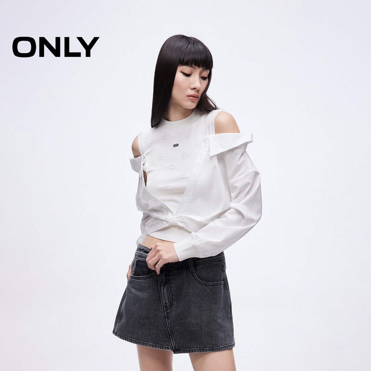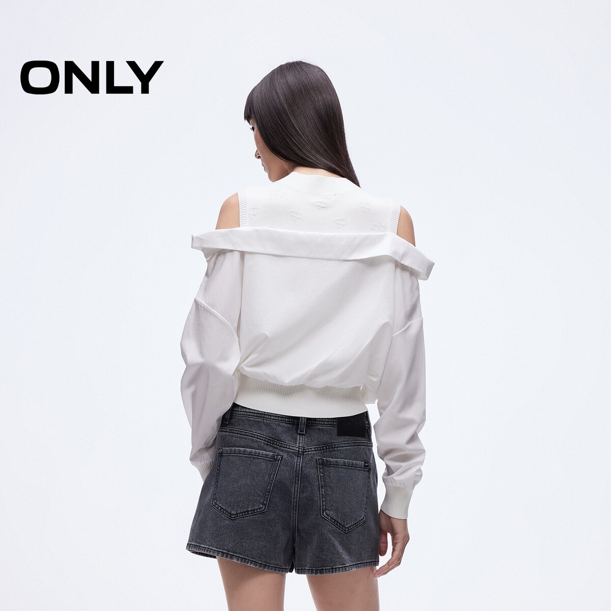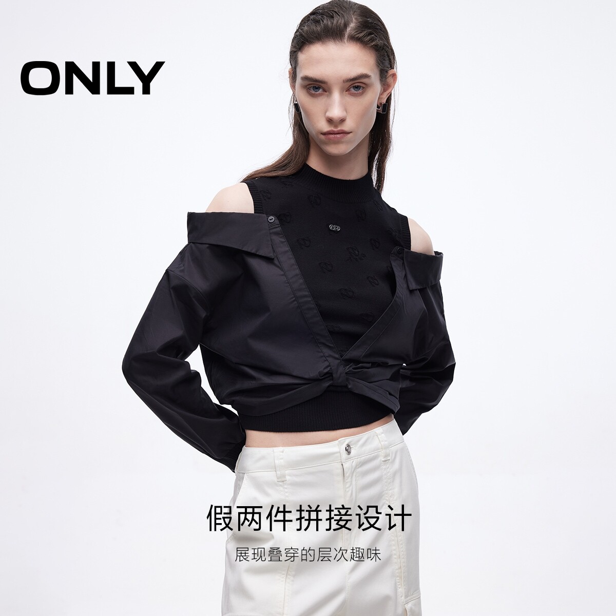 ONLY2026春季新款质感提花针织拼接设计露肩假两件针织衫上衣女