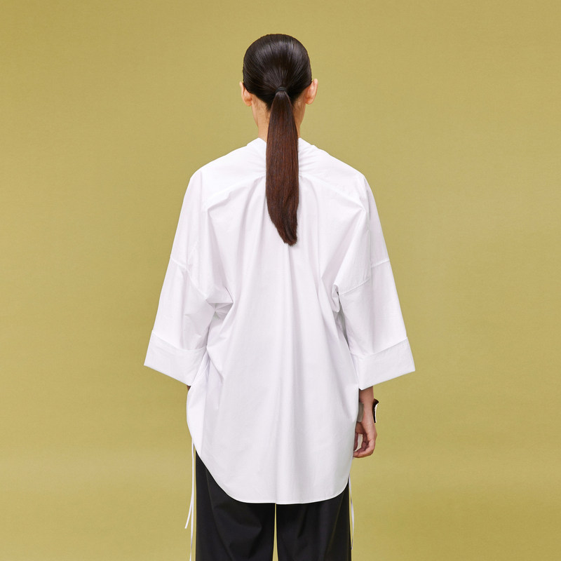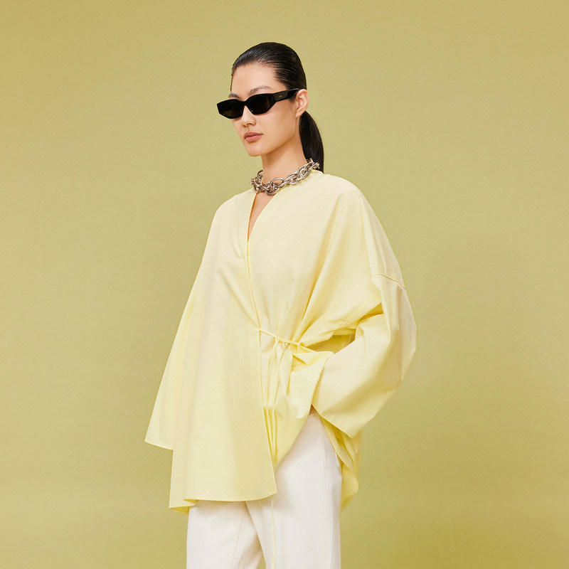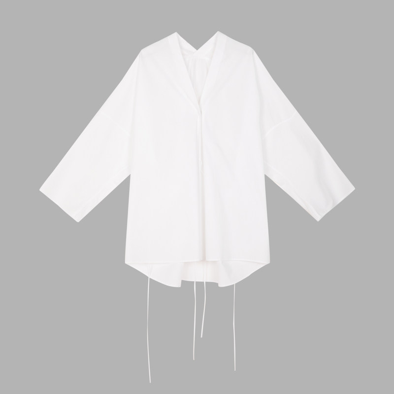 LESS春新中式改良围裹设计全棉V领大方休闲简约长袖衬衫2O3210380