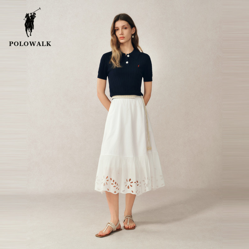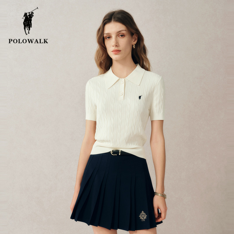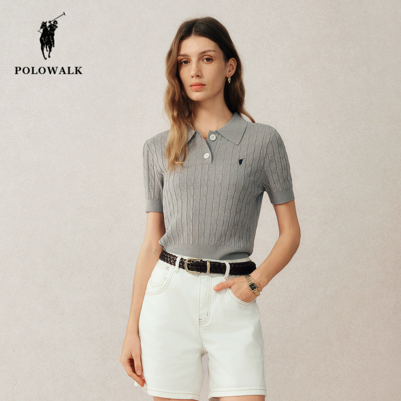 POLOWALK短袖针织衫女夏季新款保罗女装通勤气质绞花翻领T恤上衣