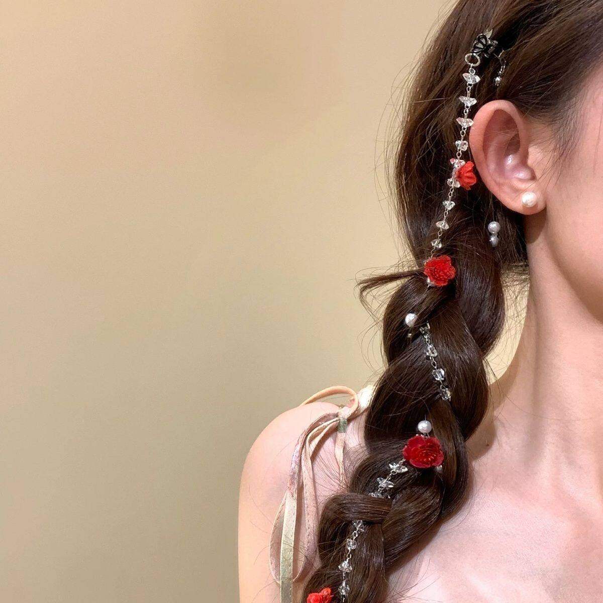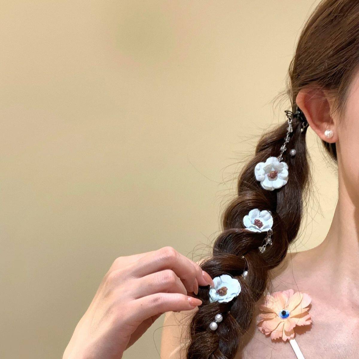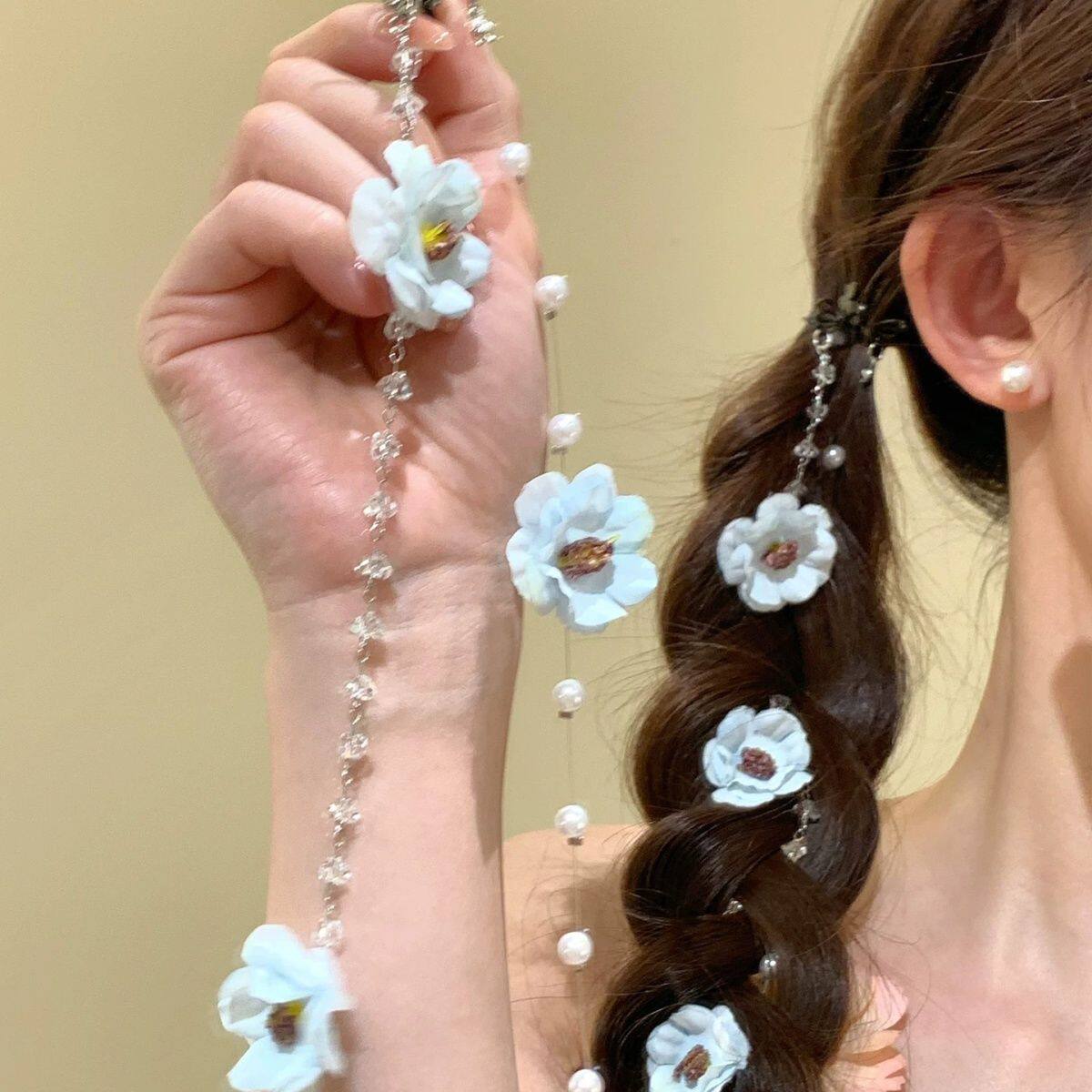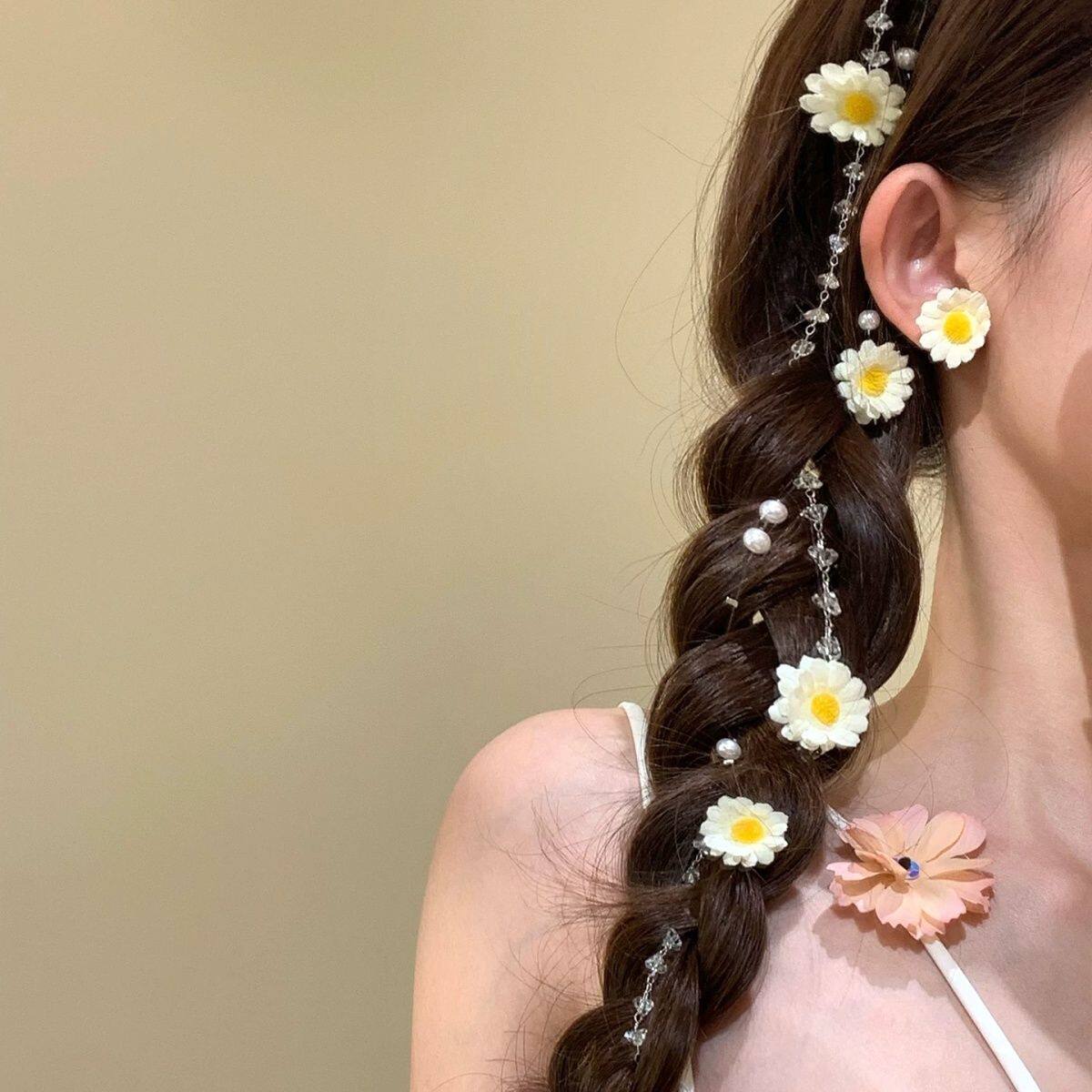 春日珍珠雏菊流苏发夹公主头双马尾编发链发饰头饰花朵蓝色红色