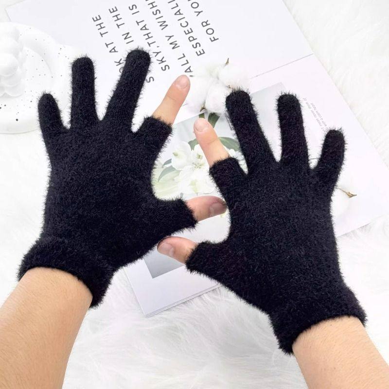 二半指仿貂毛手套秋冬学生写字骑行女露手指手套纯色通勤保暖手套