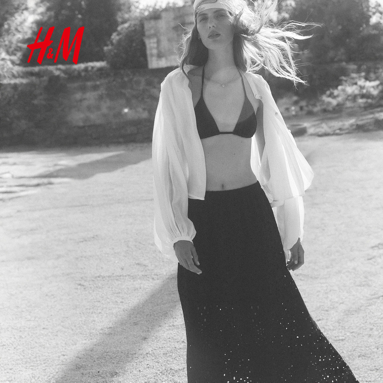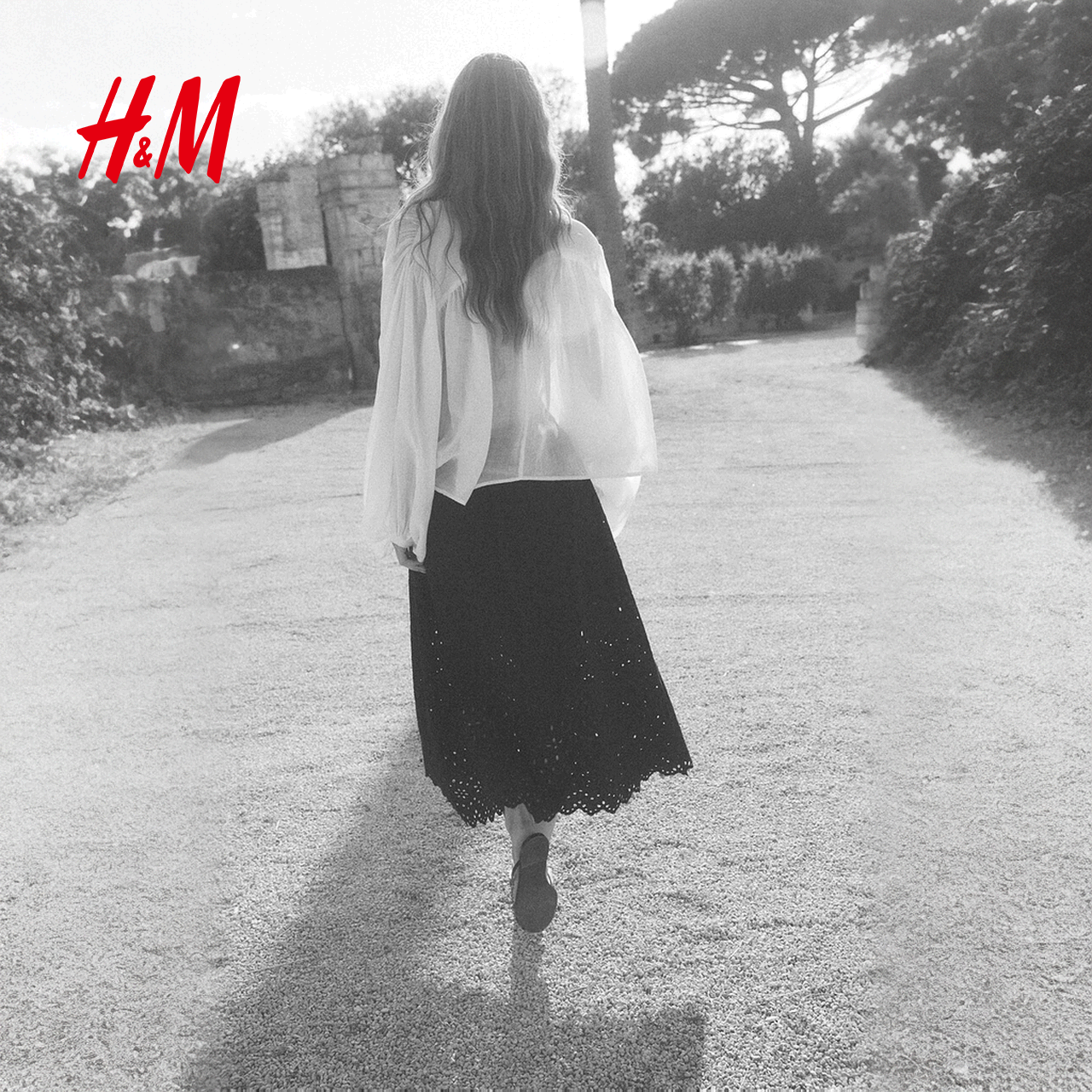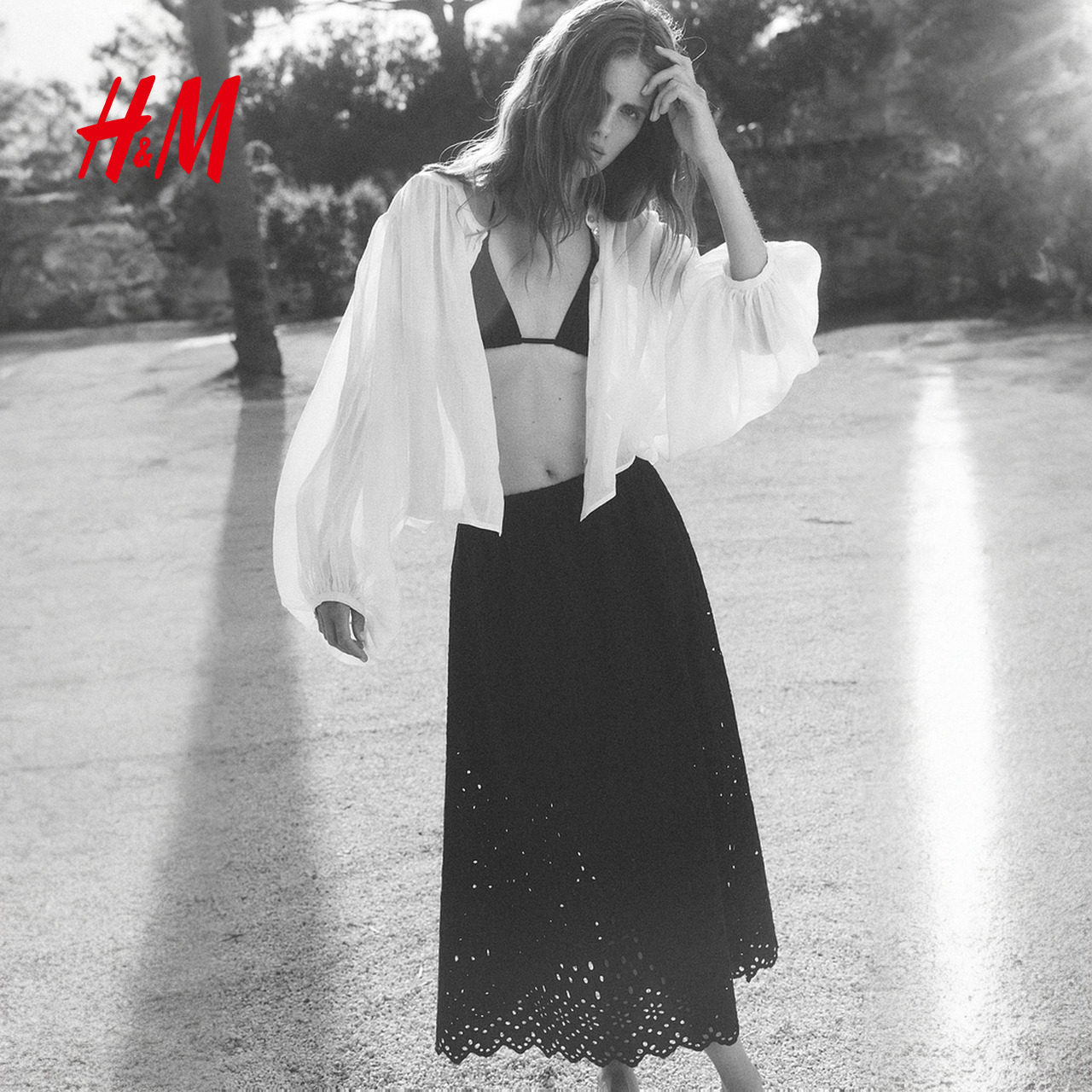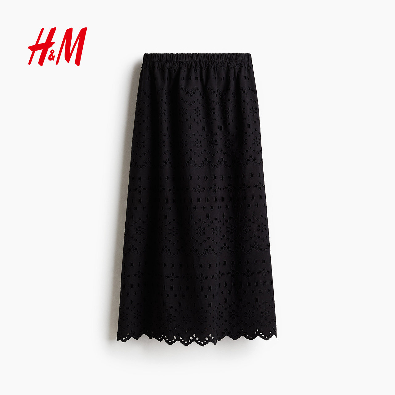 HM女装半身裙春季高腰宽松镂空刺绣喇叭中长裙1285842