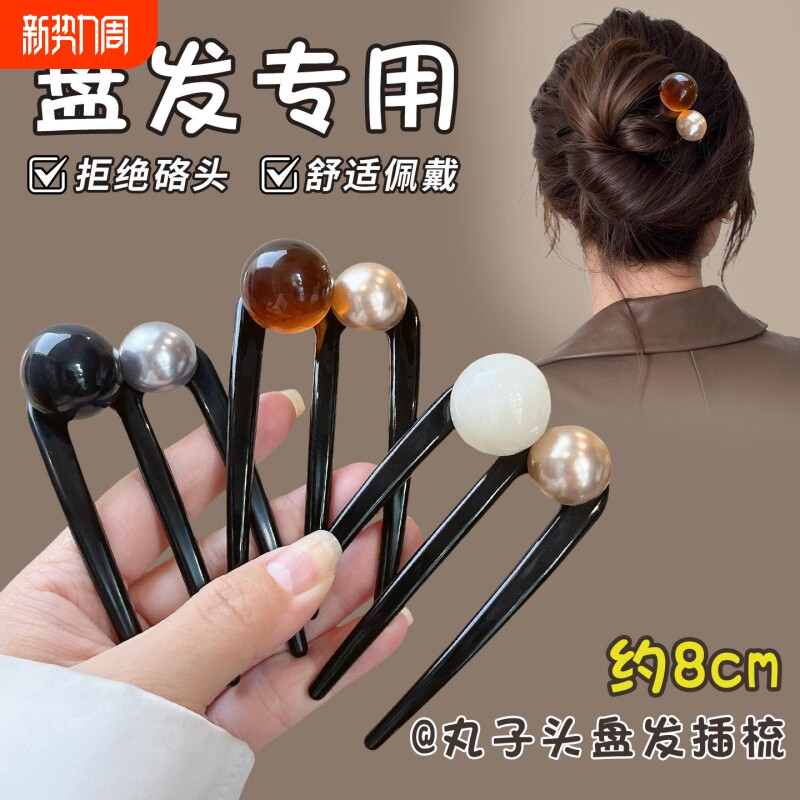高级感三齿珍珠u型发簪女日常通勤插梳发钗后脑勺丸子头盘发神器