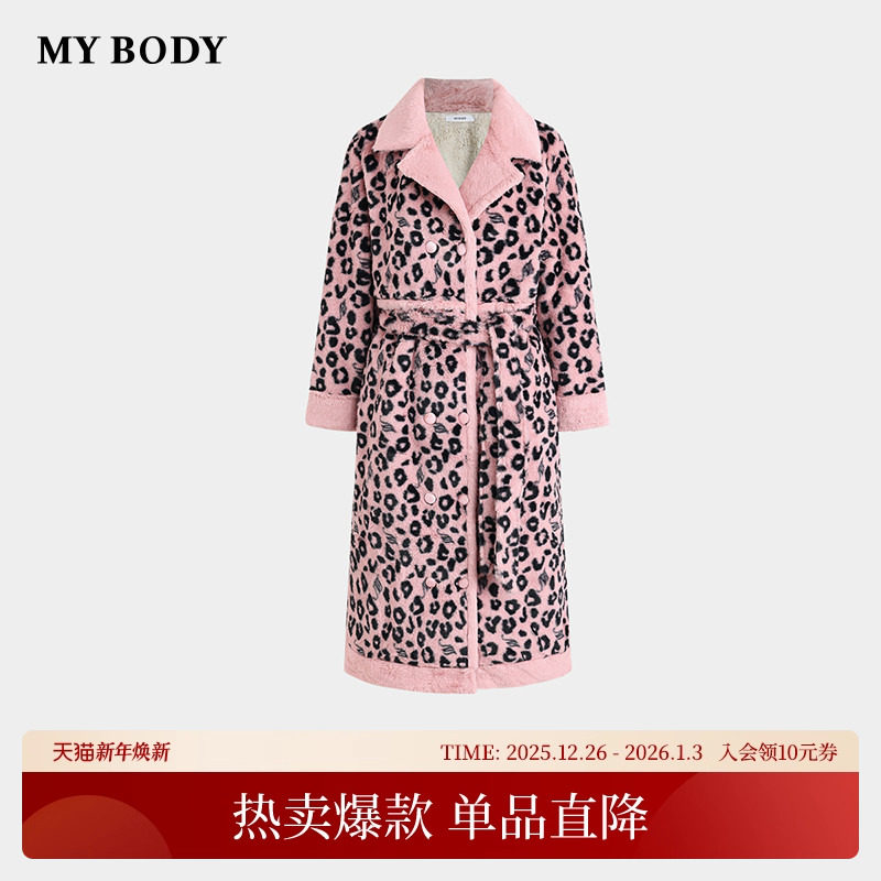 商场同款MYBODY冬季新款睡衣女款兔毛绒复古翻领豹纹印花浴袍睡袍