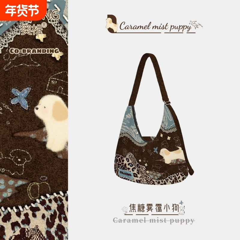 奥松原创可可粉玫小猫帆布包豹纹斜挎大容量上班通勤高级感单肩包