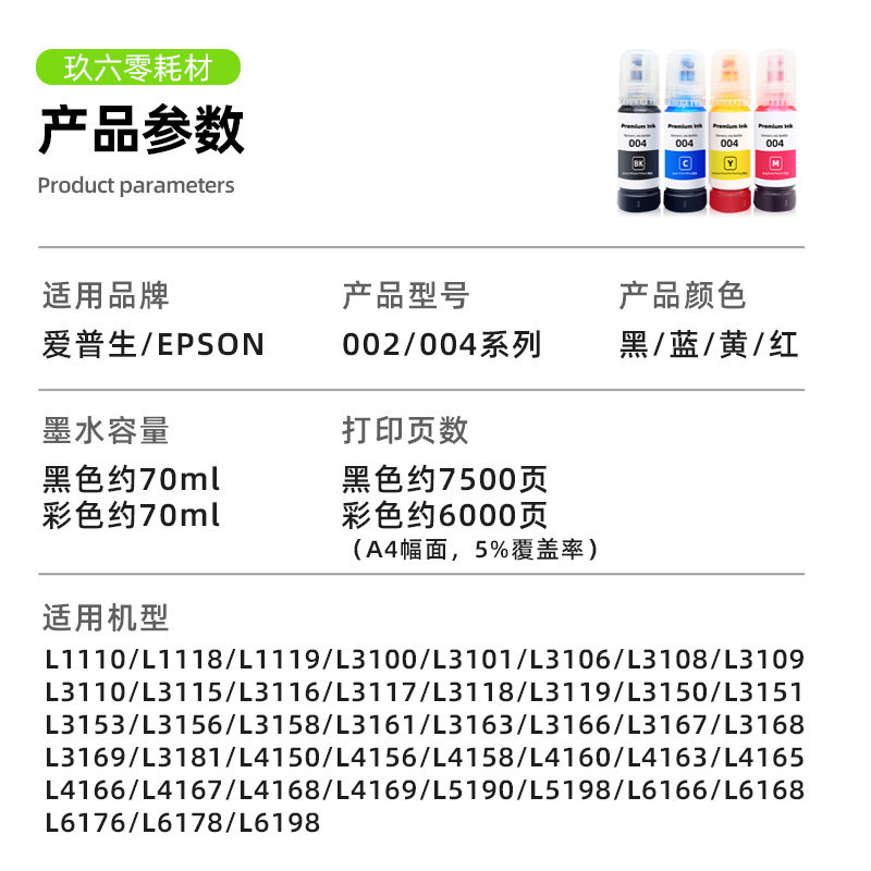 适用爱普生004 002墨水L3118 4168 3119 3153 3158原装打印机4158