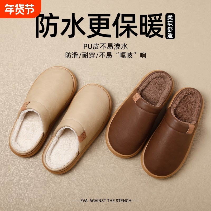 防水棉拖鞋男女冬季室内加绒保暖家居家防滑防臭抑菌PU皮拖秋冬天